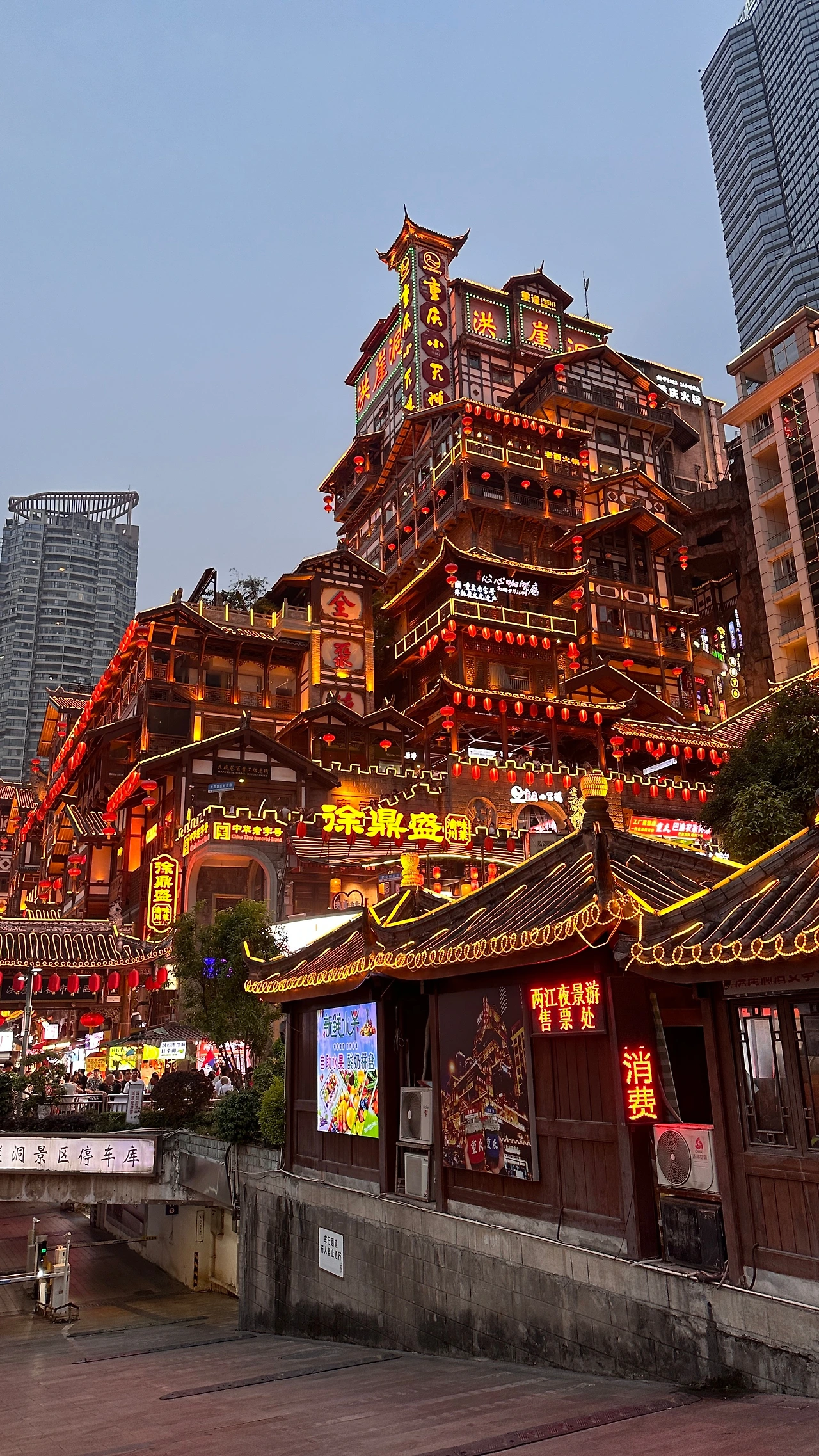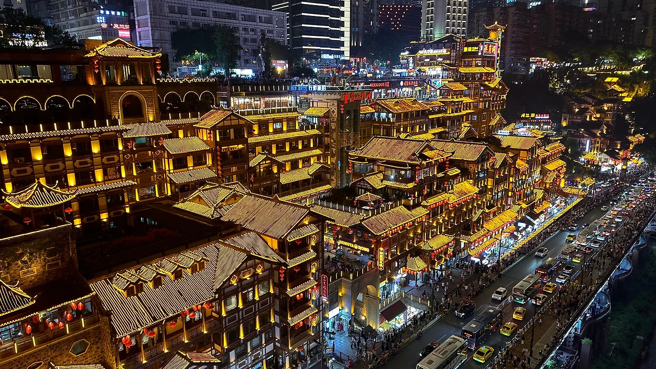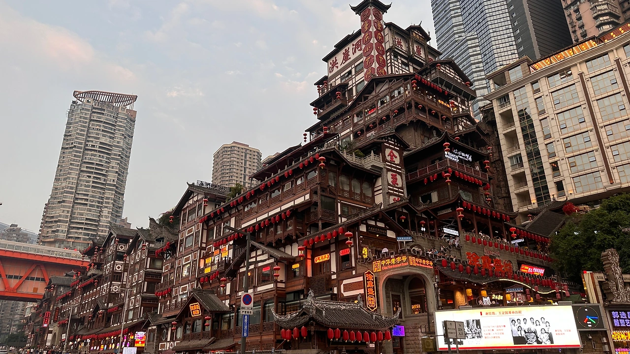저녁이 되면 잊지 말고 들러야 할 곳이 있다. 큰 절벽에 위치한 마을이라는 뜻의 '홍야동'이다. 충칭에선 비탈이나 절벽에 지어진 집들을 예사로 볼 수 있지만 그중에서도 홍야동은 황홀한 야경을 자랑하여 밤이 되면 충칭에 있는 사람들이 다 모여드는가 싶을 정도로 발 디딜 틈이 없다. 저녁 6시 즈음 점등식을 진행하는데 중국어로 무슨 안내방송이 나오면서 종소리가 몇번 울리고는 홍야동의 홍등에 환한 불이 켜지자 기다리던 관중들 사이에서는 탄성이 터져나온다.