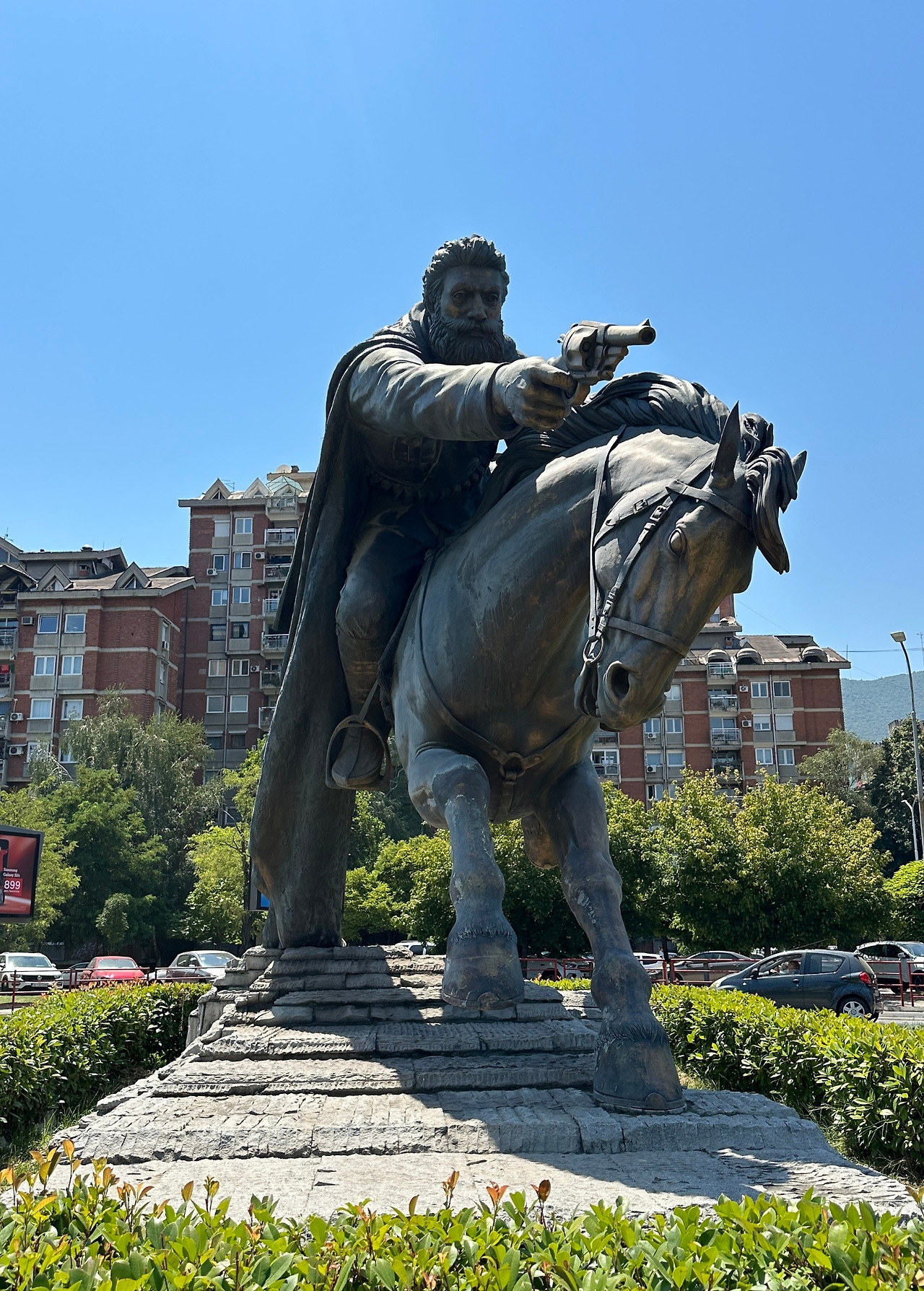 북마케도니아의 수도인 스코피예에 도착했을 때는 한낮이었다. 땡볕을 뚫고 찾아간 우리 숙소는 스코피예 도심에서는 조금 거리가 있었지만 저렴했다. 그나마 시내버스 한 대만 타면 중심가로 갈 수 있어 다행이었다. 가만히 있어도 땀이 쏟아지는 날씨에 버스 하나 타는 것도 힘든데 환승까지 했더라면 짜증지수가 치솟을 뻔했다. 그래도 버스를 타는 게 마냥 나쁜 일만은 아니었던 게, 마케도니아 광장까지 버스를 타고 가다가 굉장한 동상을 발견하고는 급히 폰을 꺼내 찍은 동영상이 꽤 멋지게 나왔기 때문이다. 동상은 크기도 컸지만 근육질의 말과 그 위에서 권총을 정면으로 겨눈 건장한 사내의 동작이 매우 역동적이었다. 동상은 보통 근엄하게 의자에 앉아있거나 말을 탄 위인의 동상이라도 우아하게 서 있는 모습이 대부분이었던 것 같은데, 이 동상은 말이 달리는 엄청난 속력과 내뿜는 콧김이 느껴지고, 온 힘을 실어 정확하게 겨눈 총구 끝에 고정된 남자의 강렬한 시선까지 마치 살아 움직이는 듯했다. 나중에 찾아보니 오스만 제국에 대항하여 마케도니아 지역에서 일어난 일린덴 봉기의 지도자였던 불가리아인 바실 체칼라로프라는 사람이었다.