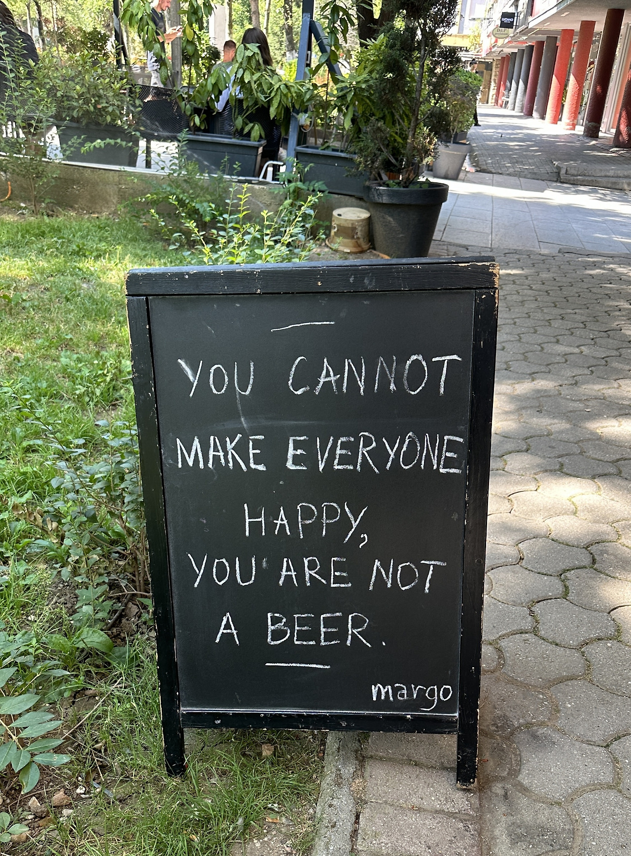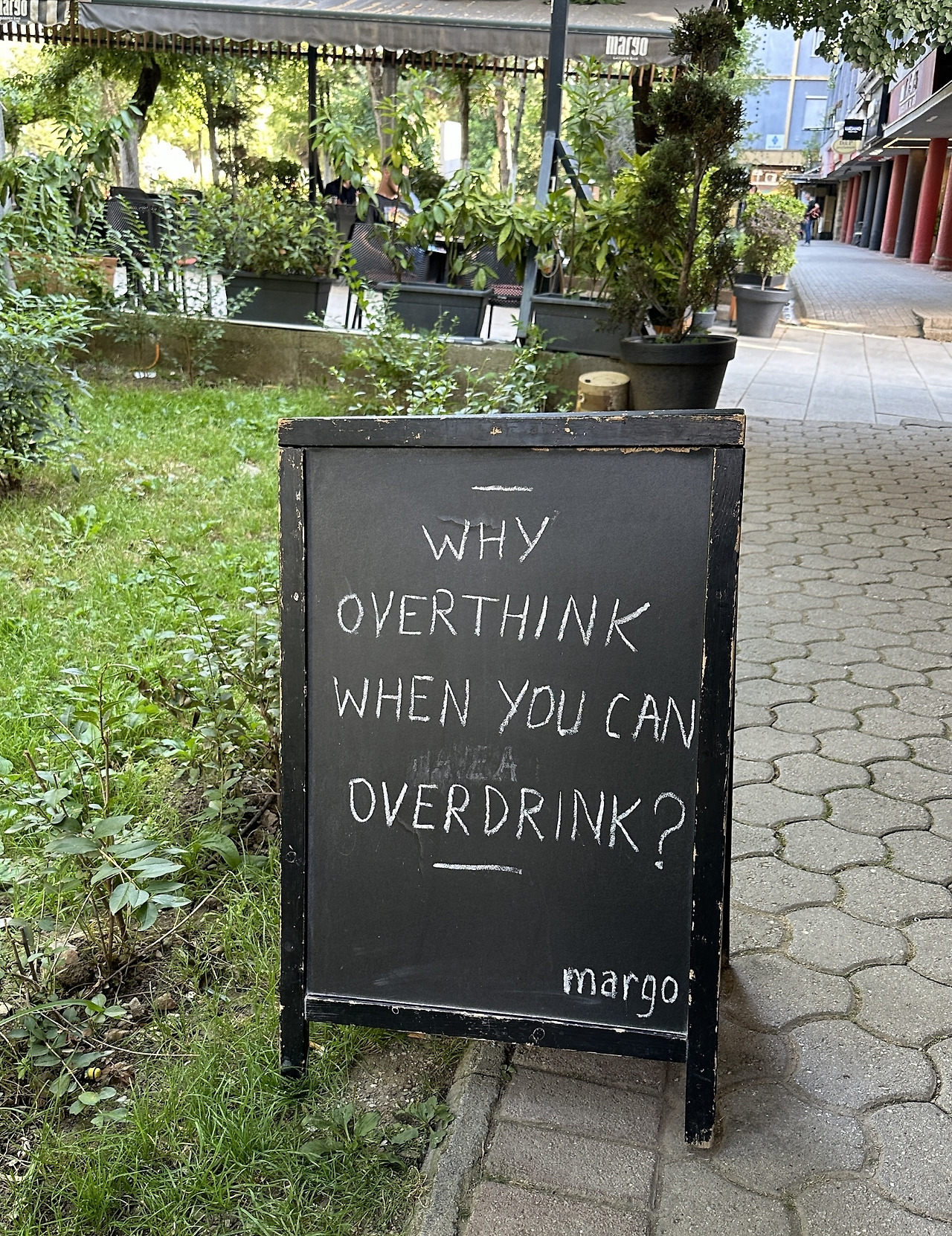 개방적 이슬람국가에 속하는 모로코에도 길에서 술을 대놓고 팔거나 밖에서 술을 마시는 현지인들은 없다 (숨어서는 마신다). 그런데 코소보는 다르다. 저녁 예배를 알리는 아단이 광장에 울려 퍼지지만 않았다면 상기된 얼굴로 잔을 부딪히며 대화에 열을 띠는 이들 중 대다수가 무슬림이라는 사실을 아무도 믿지 않을 것이다. 그렇다고 해서 이들이 나쁘다고 말하고 싶은 건 아니다. 종교적으로 독실한 것과 선한 것이 항상 일치하지는 않는다. 하람(haram, 이슬람 율법상의 금기)이라고 해서 무조건 하지 말아야 한다는 법은 없다고 생각한다. 음주와 흡연은 대표적 하람이지만, 사실 남을 해하는 결과를 낳지만 않는다면 상관없다는 의견이다. 나의 맘을 대변하듯 프리슈티나 광장의 식당들에는 술에 관한 재미있는 문구들이 아래처럼 걸려있다.