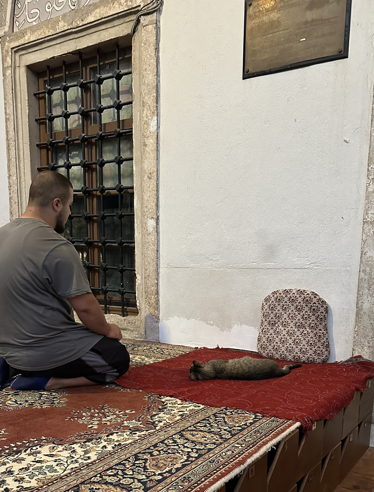 이슬람의 예배는 특별한 날을 제외하곤 그리 길지 않다. 혼자 음료를 몇 번 홀짝일 동안 짧은 예배가 벌써 끝났다. 남편이 이것 좀 보라며 안에서 찍은 사진을 보여줬다. 기도하는 신자 옆 부드러운 카펫 위에 고양이 한 마리가 등을 쭉 펴고 모로 누워 잠을 청하고 있다. 고양이를 쫓지 않고 조용히 눈을 감은 채 신과의 대화를 이어가는 신자와 평화로운 잠에 빠진 고양이가 그려내는 장면이 사랑스럽다.