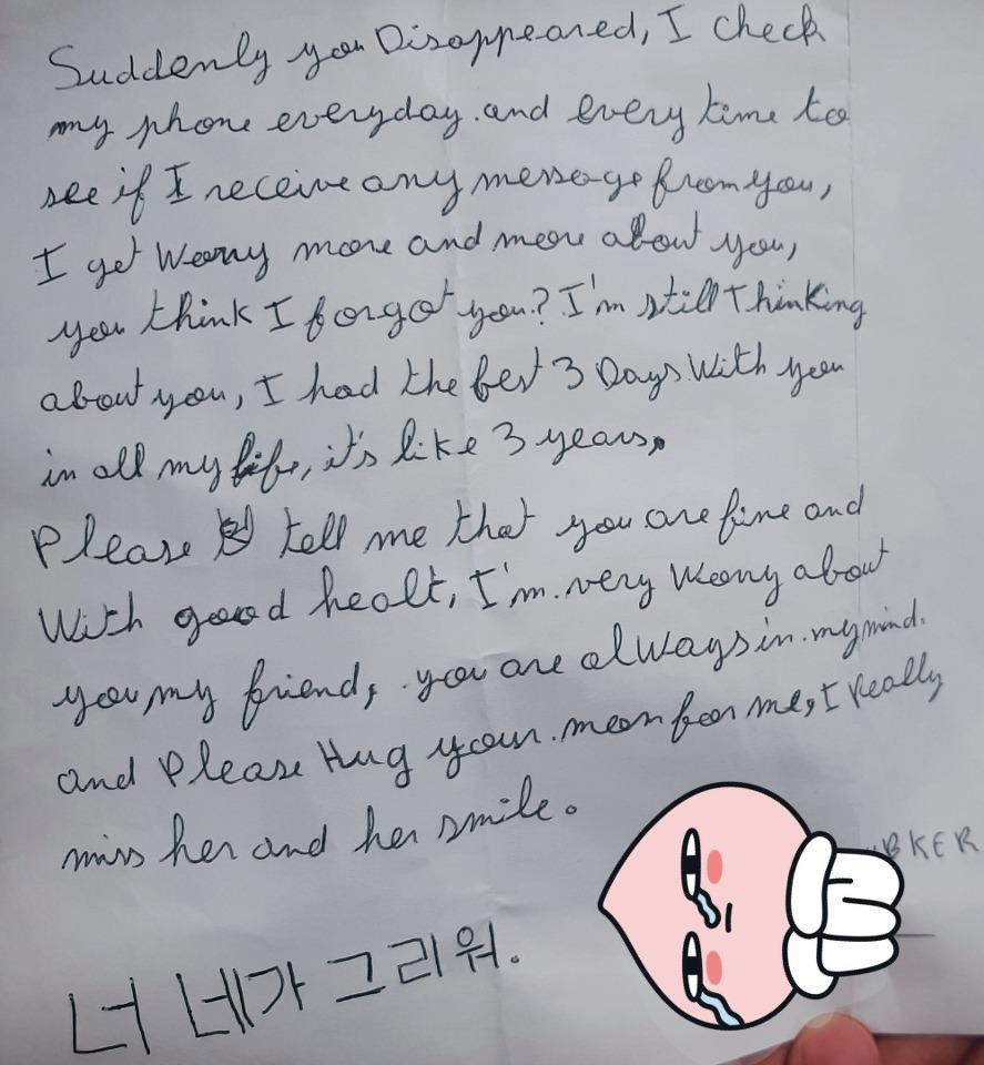 >>네가 갑자기 연락이 없어서 너무 걱정돼. 나 맨날 네 소식 기다리면서 폰 확인하고 있어. 아무 답장이 없으니까 점점 더 걱정된다. 우리가 모로코에서 3일 동안 보냈던 시간들을 난 아직도 기억해. 넌 내가 다 잊었을거라 생각하는거야? 제발 네가 잘 살고 있는지, 건강한지 소식 좀 전해줘 친구야. 정말 걱정되니까."