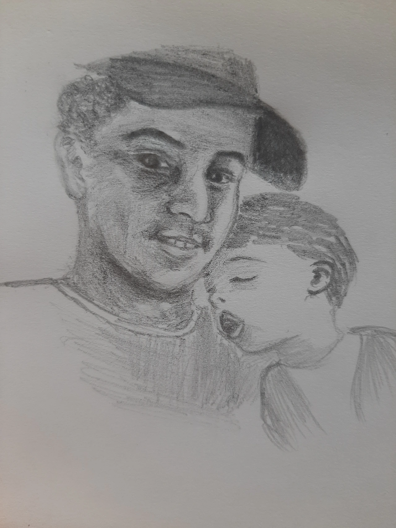 4B연필의 장점은 인물을 사실적으로 표현하고자 할 때에 극대화 되는 것 같다. 자연스레 내 그림도 캐릭터화 시킨 인물이 아닌 실물에 가까운 인물화가 되었다. 오늘의 대상은 남편과 남편의 어깨에 기대 잠든 조카 '세이프'이다.