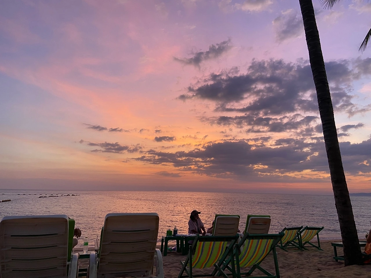 언덕배기 전망대에 오르면 파타야의 해변이 시원하게 펼쳐진다. 한낮 쨍한 햇볕이 내리쬘 때, 석양이 질 즈음에, 달이 뜬 후에. 시시각각 다채로운 바다의 색은 언제 보아도 질리지 않는다. 무더운 날씨에 움직이기 싫을 때는 해변의 비치베드를 빌려 파라솔 밑에서 주스를 홀짝홀짝 마시면 더위가 주춤한다. 오후 5시 무렵 바다는 주황빛 보랏빛으로 서서히 물들기 시작한다. 그때쯤이면 주인 아저씨께서 해넘이를 잘 감상할 수 있도록 파라솔을 걷어주신다. 우리는 눈을 반쯤 감고 느긋하게 누워 발 아래로 찰랑이는 바다물결을 오래오래 바라보았다.