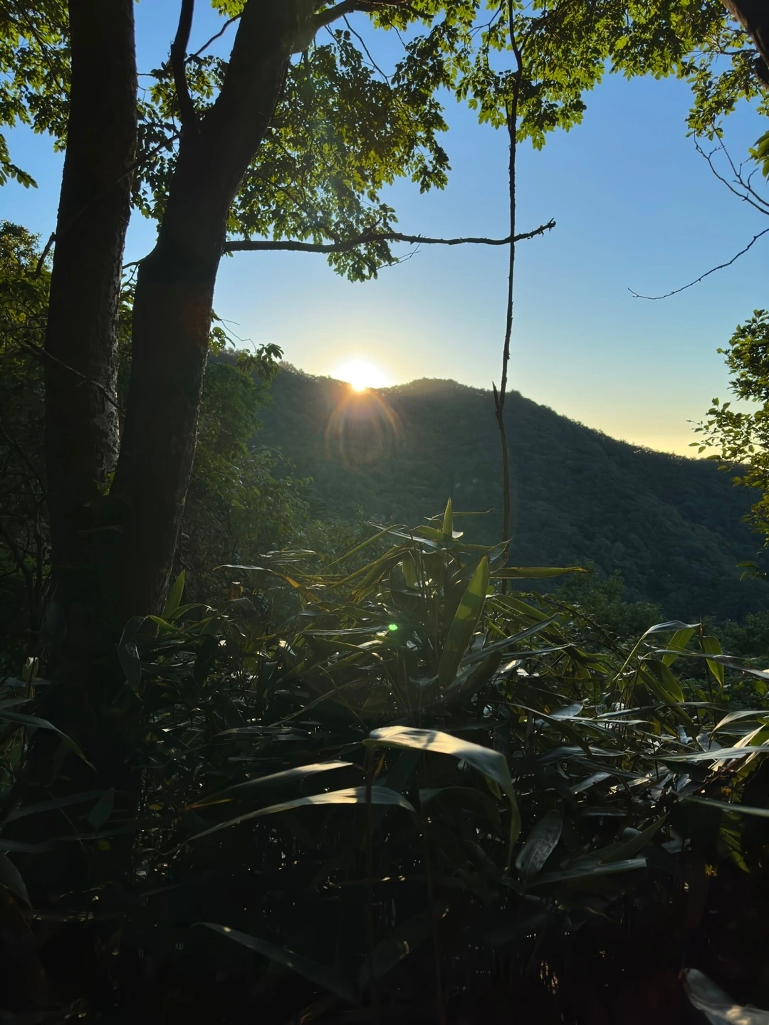 시간이 좀 더 흐르자 해가 낮은 봉우리들 위로 떠올라서 나뭇잎에 반사되어 반짝였다. 날이 밝으니 선명해진 산세가 나무 사이로 엿보였다. 정상에 올라서 바라보면 얼마나 더 빼어날까 두근거렸다.
