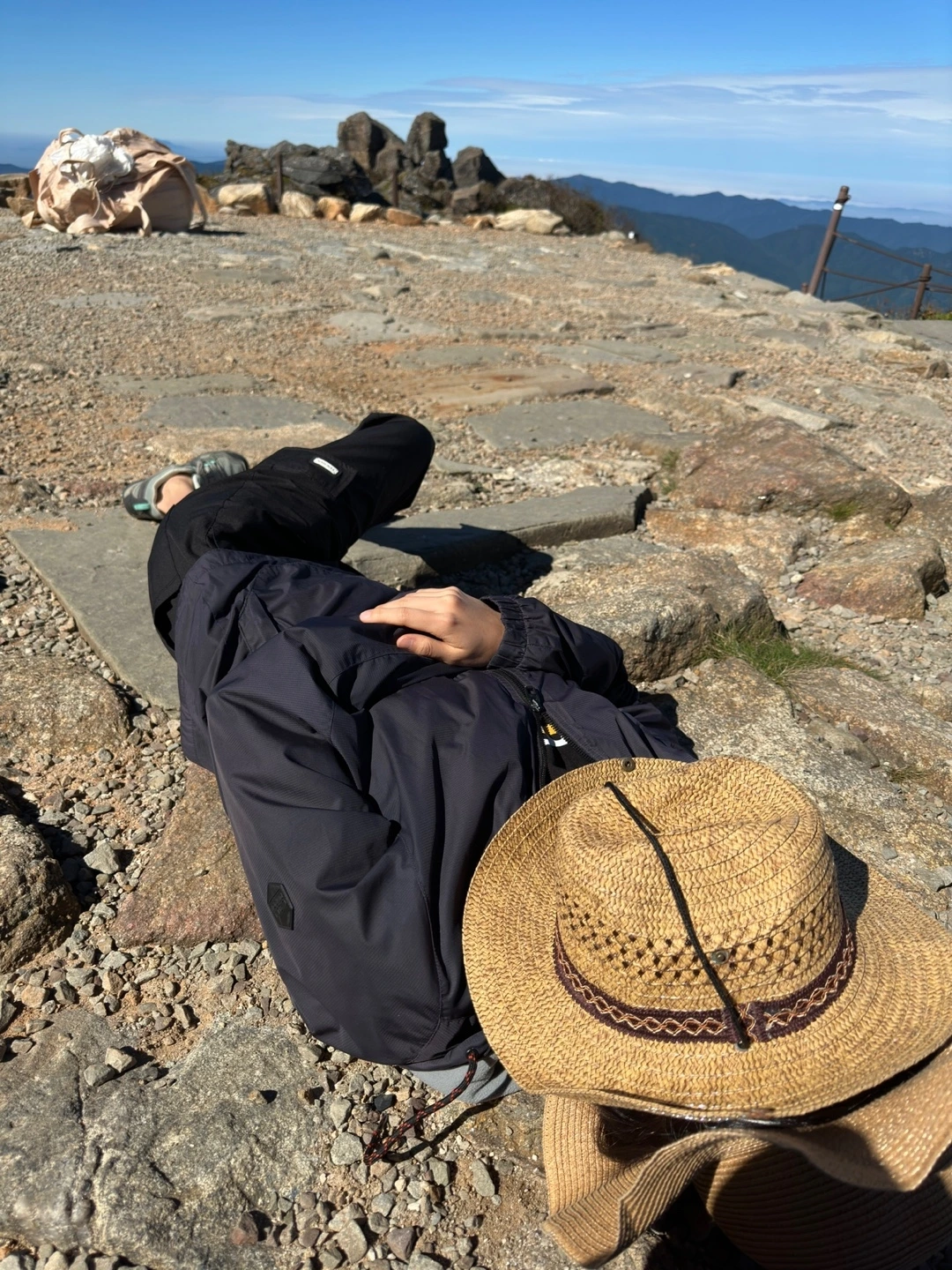 지리산 꼭대기에서의 낮잠.내려오는 길은 고통의 연속이었다. 고질병인 무릎도 아프고 발가락도 신발 속에서 팅팅 부어 디딜 때마다 악 소리가 나왔다. 올라갈 때는 힘들어도 천왕봉이라는 목표가 있어서인지 기쁘게 올랐는데, 내려갈 때는 제발 나 좀 여기서 꺼내주오 소리가 절로 나왔다. 여기 케이블카 없냐구~