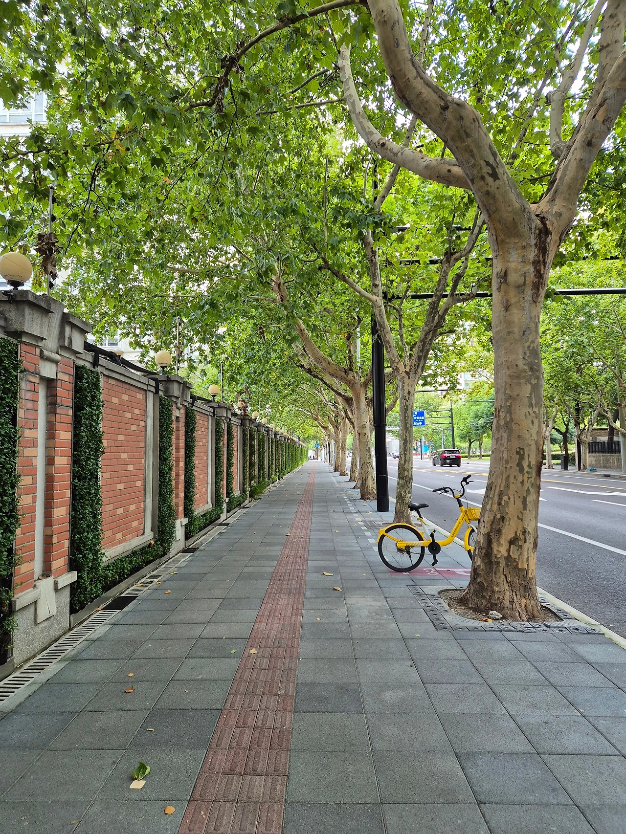 노란색 공유 자전거가 줄지어 세워진 길가.