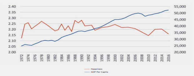 소득과 행복의 관계를 최초로 연구한 분은 Richard Easterlin이라는 경제학자입니다. 이스털린(Easterlin 1974)은 전후 30년 간 미국 경제가 지속적 성장을 이루었음에도 불구하고 미국인의 행복 수준은 60년대 이후 하락하는 현상을 보여주었습니다. 이스털린이 보여준 소득과 행복의 모호한 관계를 우리는 이스털린의 역설이라 부릅니다. 이스털린의 역설은 시기를 1970년대부터 2010년대 중반까지 확장해 보아도 유사한 양상을 보입니다. [그림 1]에서 보는 바와 같이 미국의 경우 파란색으로 나타난 1인당 국민소득은 지속적으로 증가했음에도 오렌지색의 행복은 2000년대 이후에는 하락하는 현상을 보여줍니다. 행복과 소득 관련 다수의 국가에서 유사한 연구가 진행되었는데 대부분 국가에서 이스털린의 역설은 확인된 것으로 나타났습니다.
