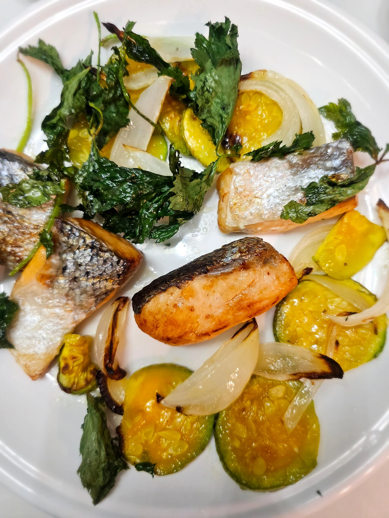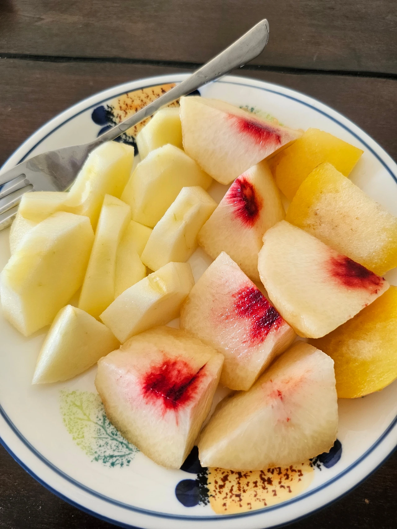 오늘아침 복숭아,사과,자두 과일접시/ 아들이 에어프라이로 연어구이