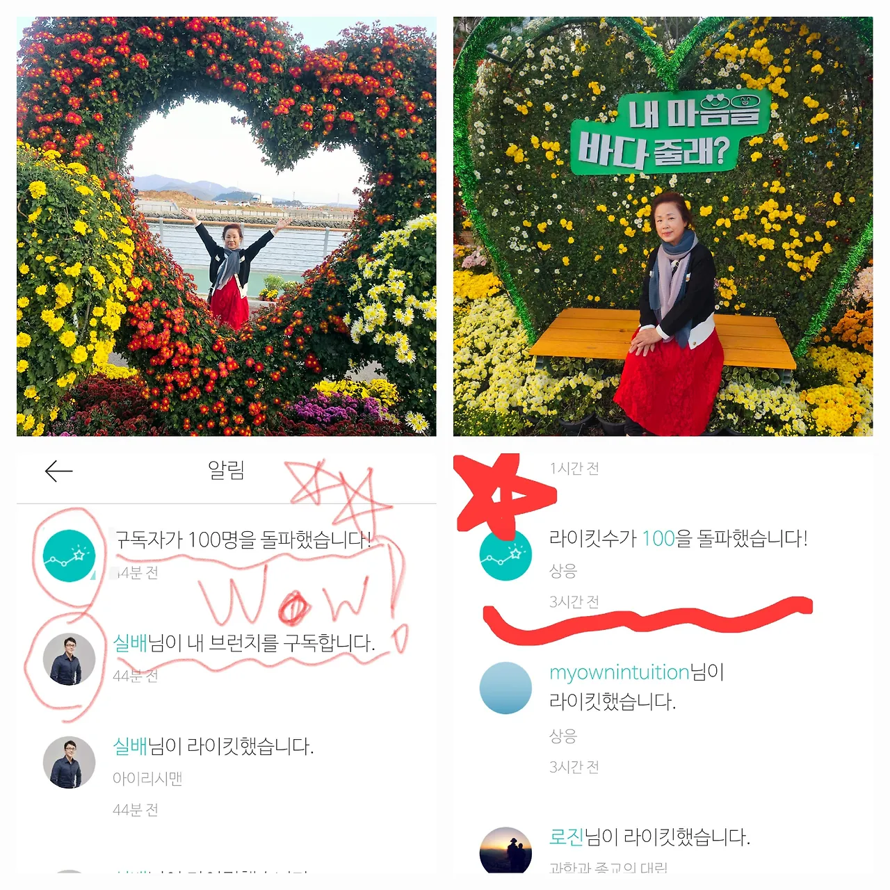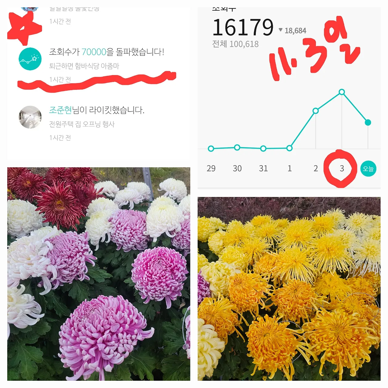 구독자 100명 돌파에 와우~!!^^ 연재하던 시 라이킷수 100돌파에도 우와~함성이었다. 11월 초 국화축제 연 삼일 동안 조회수 고공행진이었다
