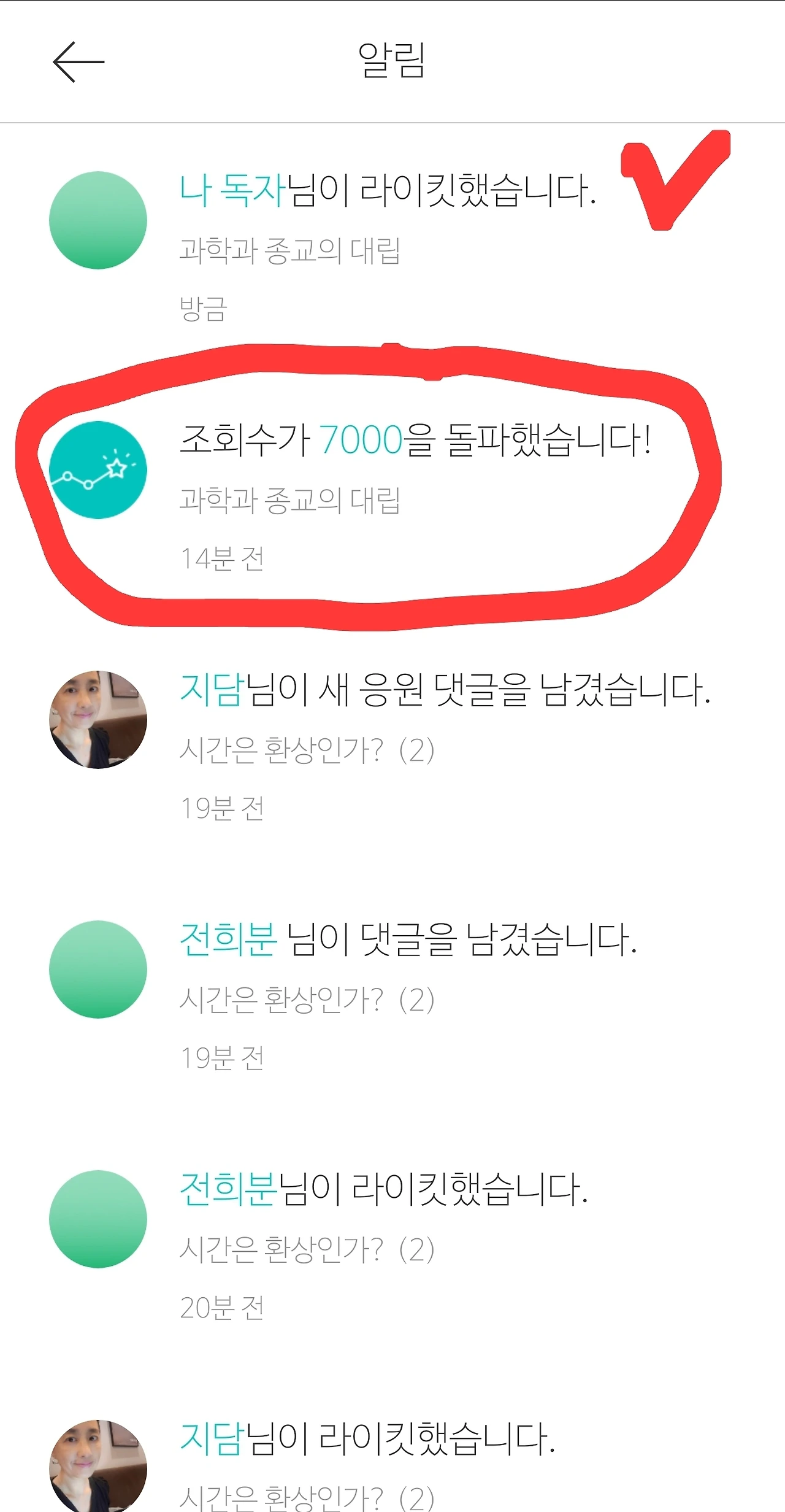암튼 그렇게 나는 부지런히 대가족의 후원과 지인들, 그리고 몇몇 작가님들의 후원으로 응원 댓글을 받는 혜택을 누리게 되었다. 덕분에 새 연재물의 첫 글 ‘과학과 종교의 대립’은 Daum에서도 노출이 되었는 지 조회수가 8천이 넘어갔다. 그리고 라이크잇이 230명이 되었다. 이전의 구독자수 170명으론 실현 불가능한 결과였다.