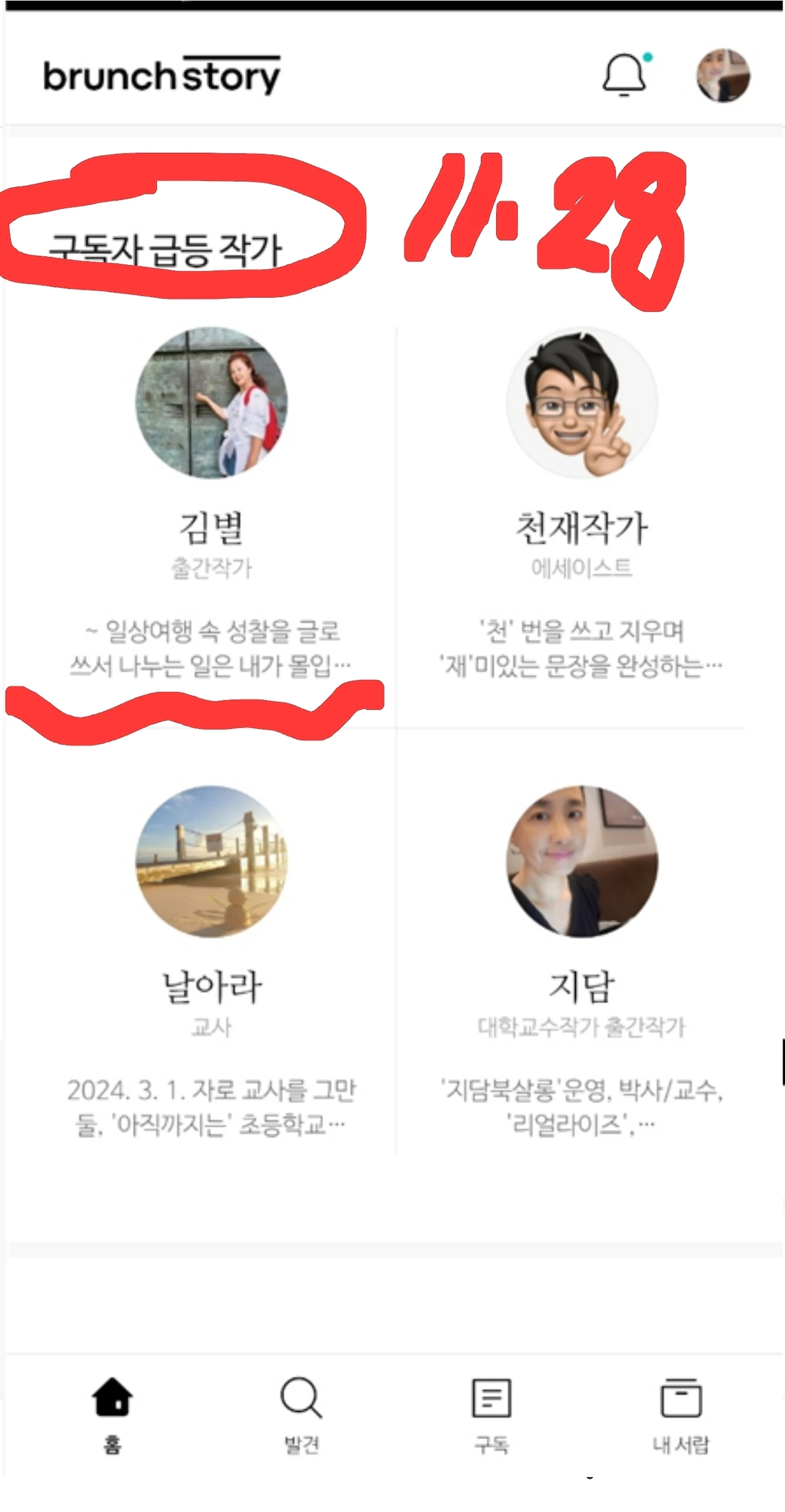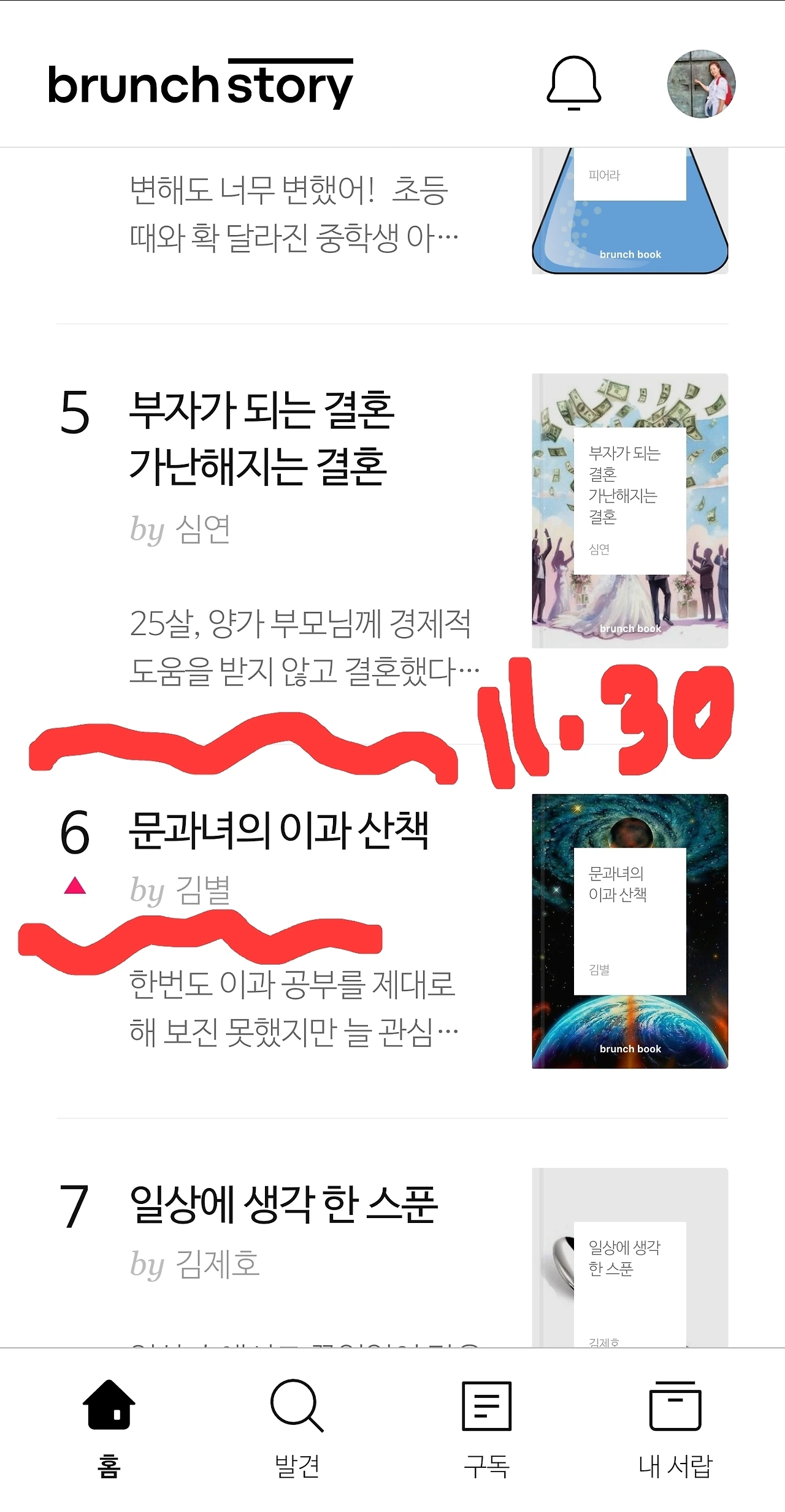 두 연재 시작하고 나서는 정말 매일 써 내는 연재글로 쓰는 고생도 보람도 풍성한 한 달이었다. 덕분에 구독자 급등작가도 되어보았다. 그리고 요즘 뜨는 브런치북에 내 브런치북이 소개되기도 하여 더욱 기부니가 좋았다 ㅎㅎ