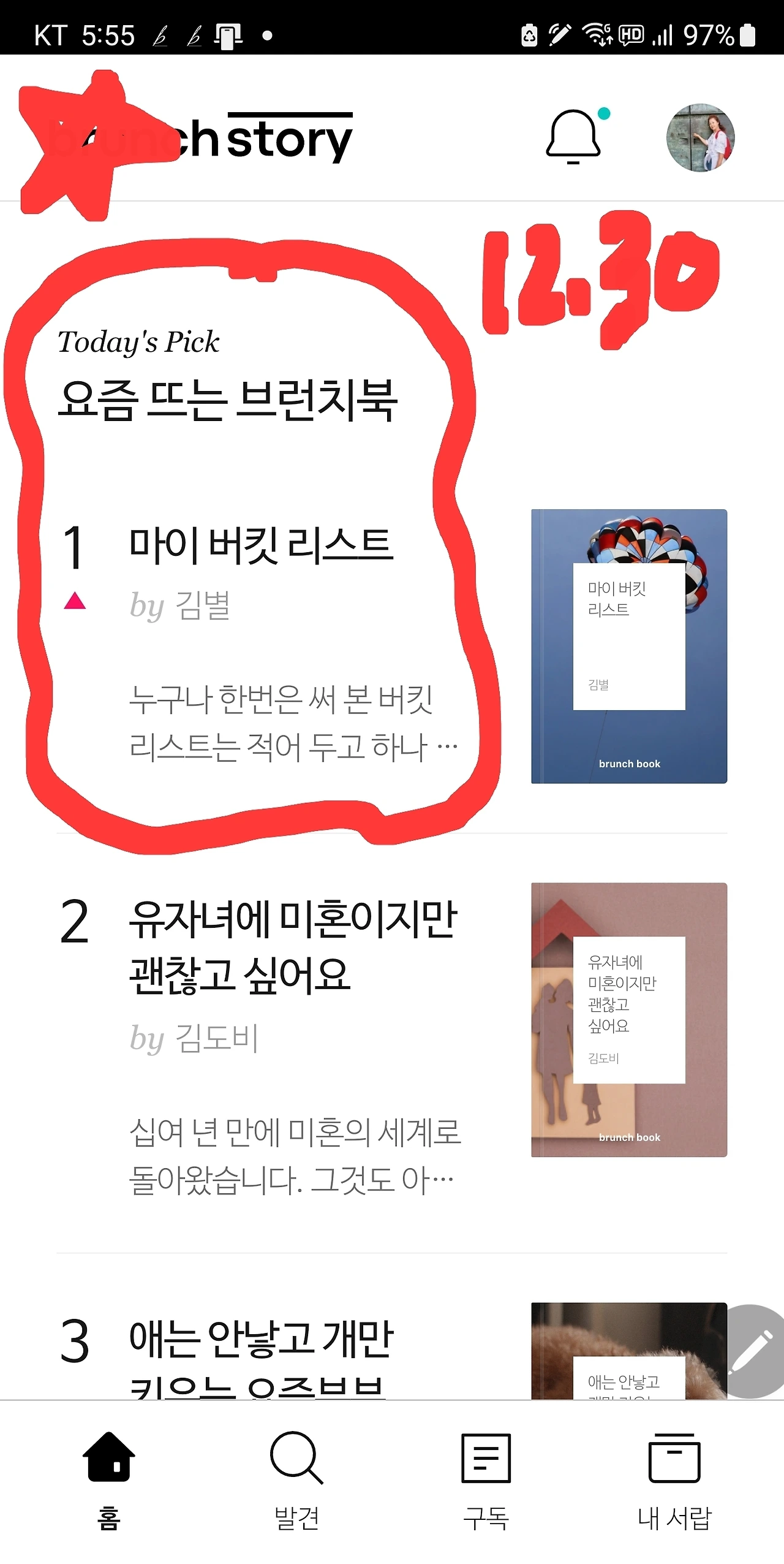 그리고 방금 확인한 사실인데 오늘 ‘요즘 뜨는 브런치북’에 나의 연재 ‘마이 버킷리스트’가 1위로 올라와 있다. 새로 시작한 연재글 ‘책 속으로 떠나는 한 줄 여행’이 며칠 전 4위로 올라있었는데 다시 다른 연재가 이렇게 1위로 등극하니 놀랍고도 감사하다. 12월의 연말 결산 성취가 풍성하니 정말 새 연재물을 추가한 보람이 있다.