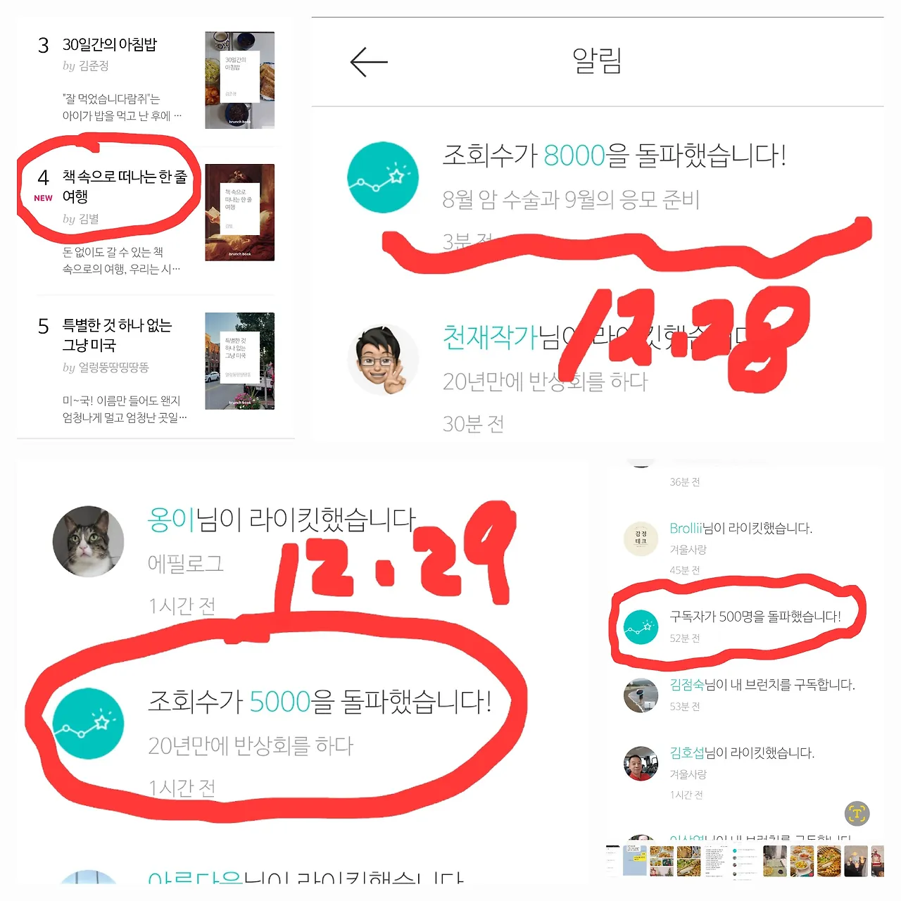 마이 버킷 리스트의 지난 목요일 글 ‘20년 만에 반상회’가 조회수 5000회를 찍었고 마이 브런치 다이어리 연재글 ‘8월 암수술과 9월 응모준비’가 조회수 다시 폭등으로 8000회를 찍었다. 이 모든 것이 이모저모로 다 연결되어 구독자 수 증가로도 연결된 거 같다. 브런치가 글쓰기 플랫폼으로서 아직 부족한 면도 있겠지만 여러 가지 방법으로 글쓰기를 장려하고 응원하는 듯하다.
