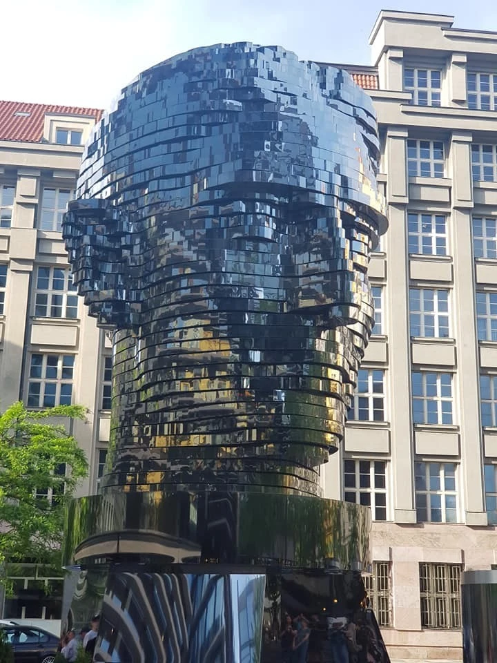숙소로 돌아가려고 트램을 기다리다 이 큰 상가건물 뒤에는 뭐가 있지? 하며 들어가 본 곳 뒤 편에서 뜻밖에 ‘카프카의 얼굴’을 만났다. 유명한 조각가가 만든 작품인데 10미터 높이니 주변 건물만큼 크다. 놀라운 것은 계속 얼굴이 형태를 바꿔가며 허물어졌다 다시 얼굴로 돌아오고를 반복하며 동시에 사방으로 움직인다. 마치 카프카의 변신처럼. 유대계 동 유럽인으로 자기 정체성을 찾아 고민했을 작가의 모습, 부친의 냉대와 모멸 속에 견디며 글을 써야 했던 작가를 잘 대변한 조각 작품이 아닌 가 싶었다.