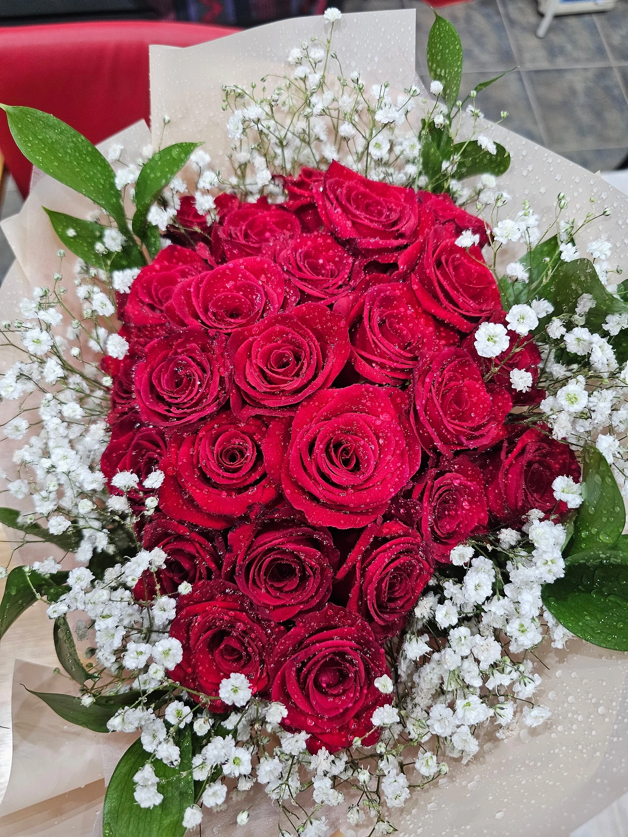 아들이 사 준 장미안개꽃다발 시들지 말라고 물을 뿌려주었다