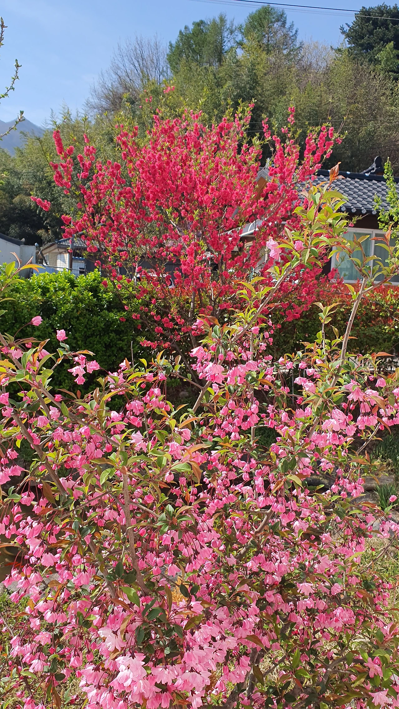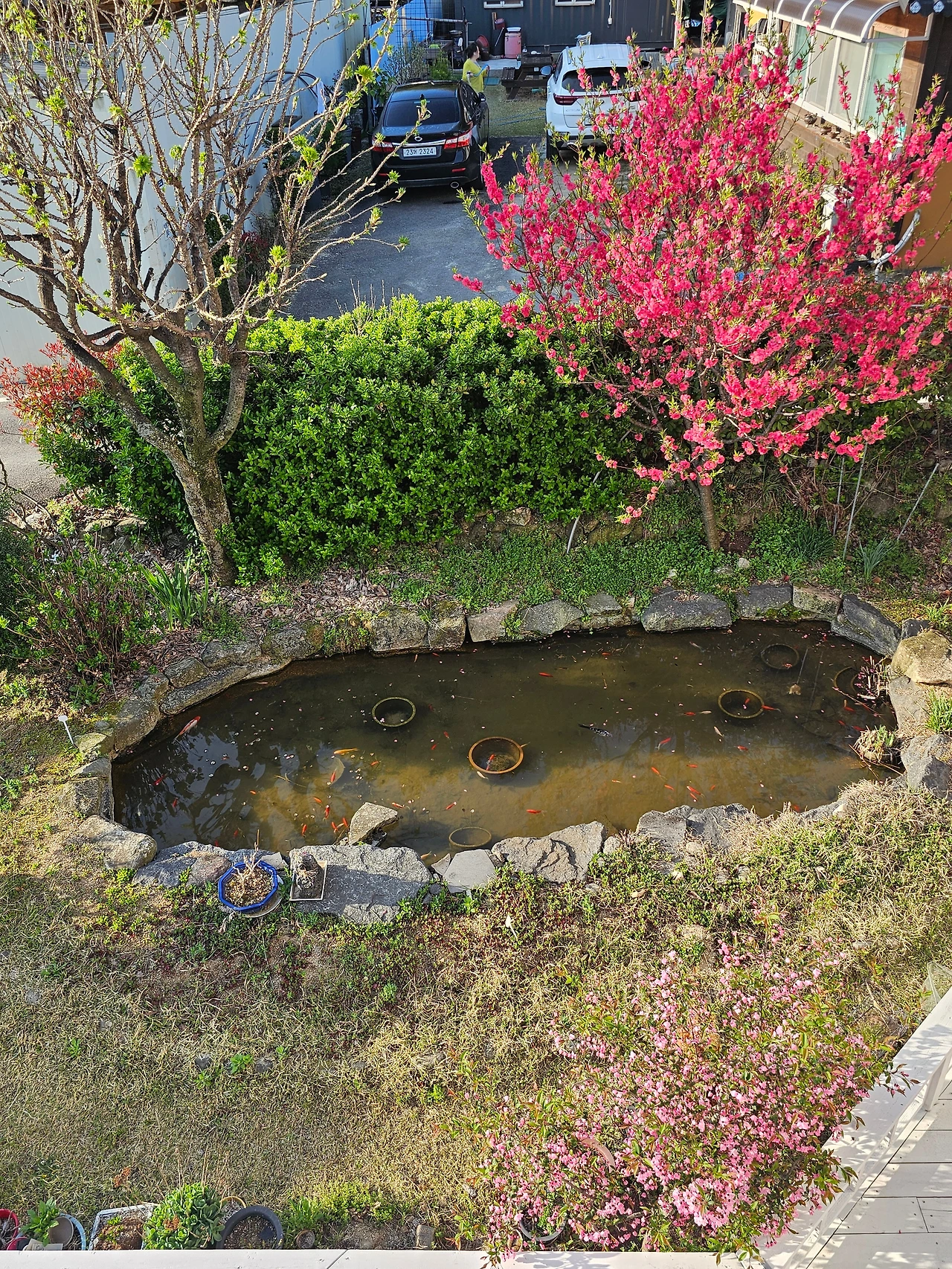 마당연못가에 홍도화꽃이 만발했다. 흰 데크옆 산당화도 만개하고. 전원집에 있는 꽃도 못 보고 지나갈 뻔했다. 5도 2촌 생활이라 해 놓고 지난 달은 감기로 인해 몇 주째 못 와 봤는데 서울 갔다 오면서 중간에 들리긴 딱 좋다.