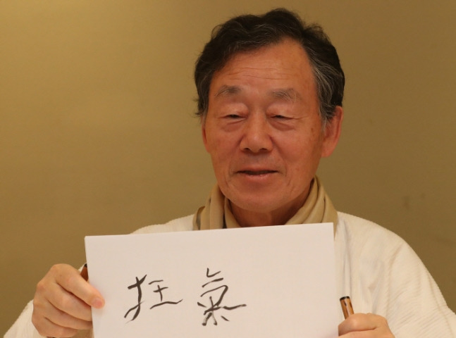 2018년 산문집 ‘꽃을 꺾어 집으로 돌아오다’ 출간 간담회에서 한승원 작가가 광기(狂氣)를 써 보이며 살아있는 한 글을 쓸 것이라 말한다.