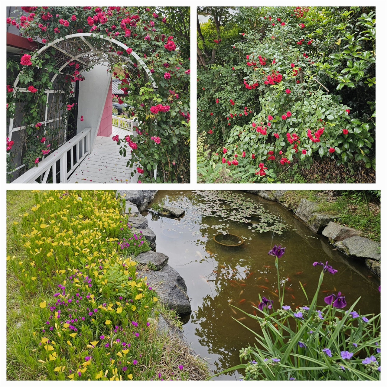 ▲ 유월의 전원주택 장미아치와 연못가 꽃들