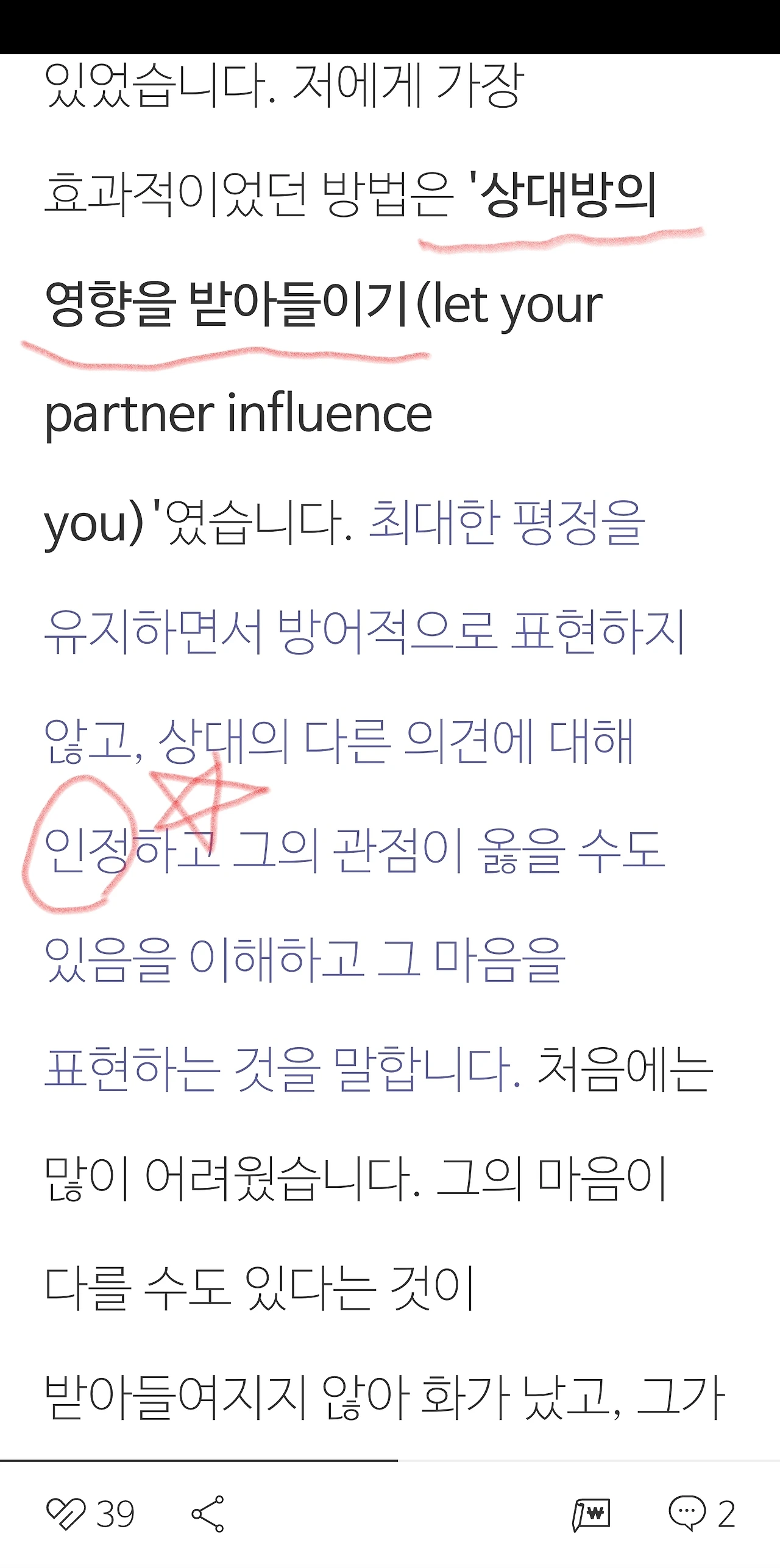 이제 내가 방어기제를 낮추거나 없앰으로써 남편과의 자존심 겨루기나 스스로 벽을 치고 화를 내는 대신 공감으로 간다면 어떻게 될까? 그러면 화 내고 수습하면서 쓰는 에너지를 보다 생산적인 대화를 하기 위해 쓸 수 있을 것이다.