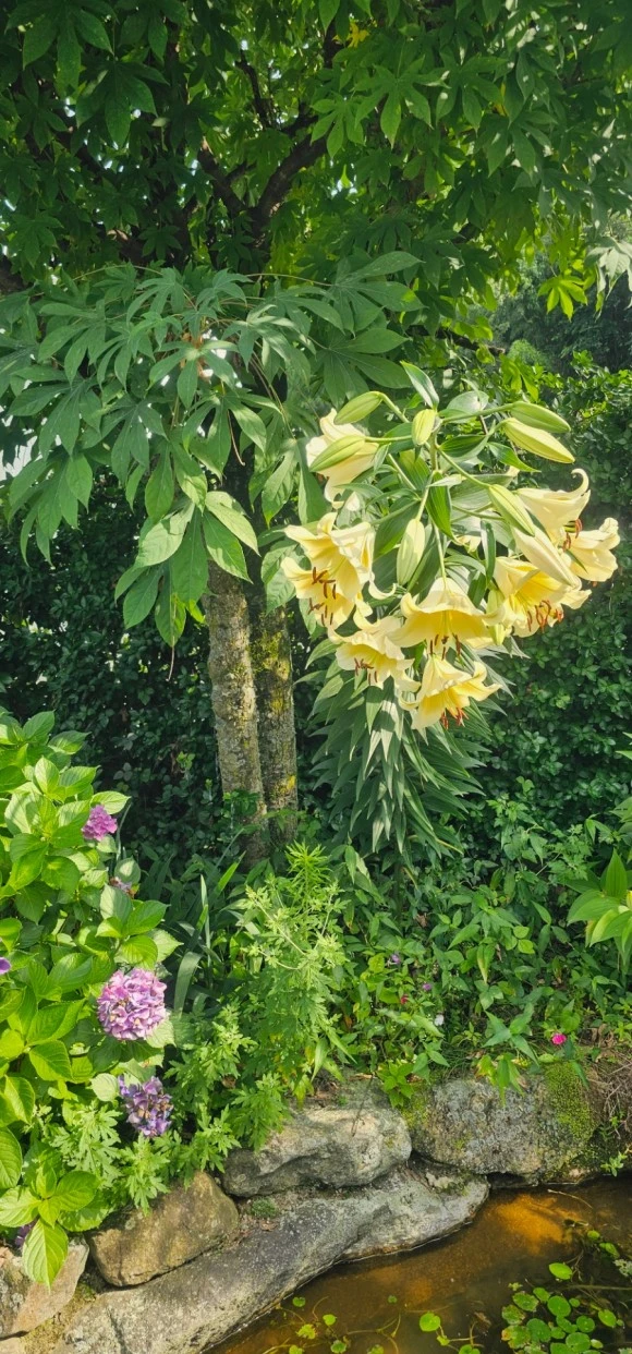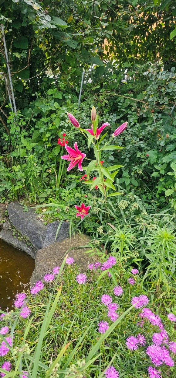 엄나무 옆에 보라색 수국도 잘 피어있고 백합은 고개가 거꾸러져있다