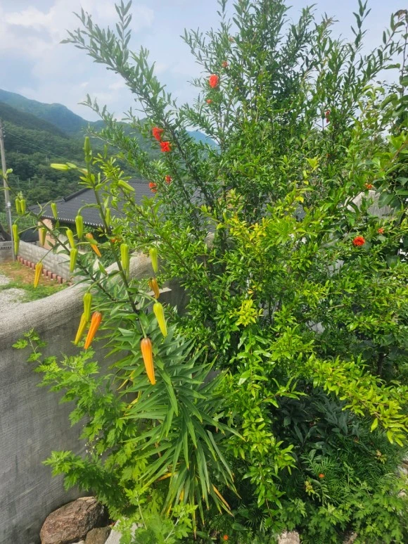 석류꽃이랑 내가 밭 무덤가에서 가져와 심은 나리꽃도 개봉박두다 (230710)