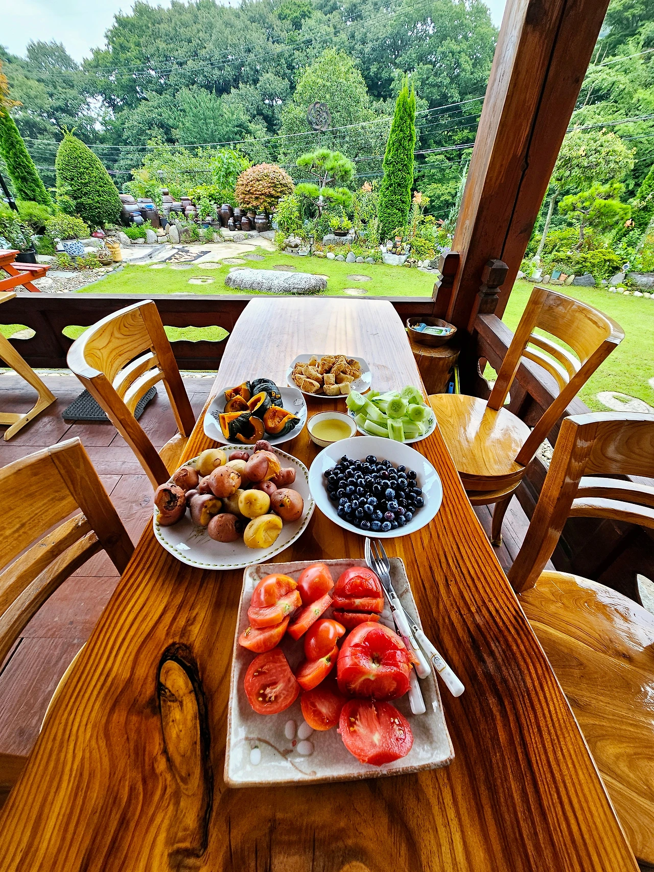 너무 이른 시간인 지 남편은 안 가려 한다. 할 수 없이 혼자 가니 부지런한 언니는 정갈하게 아침상을 차려놓으셨다. 블루베리랑 오이, 감자등은 텃밭 소출이다.