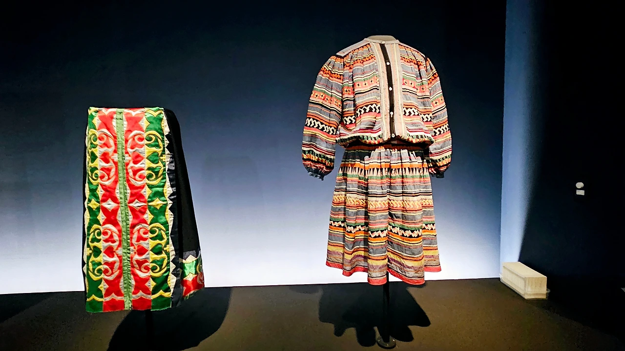 왼쪽 사진은 독수리와 청둥오리 깃털로 장식한 드레스다.