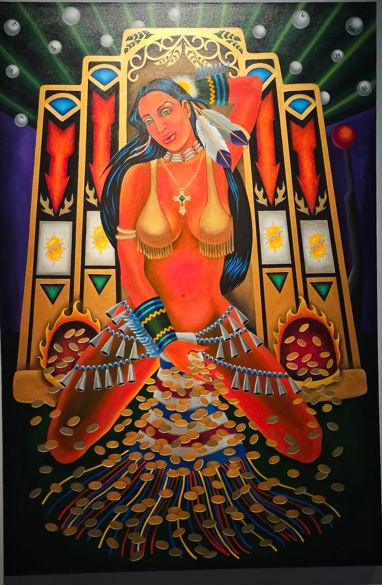 캘리포니아 출신의 원주민 예술가 주디스 로우리는 오랜 세월 부족이 모여 사는 땅에 카지노*가 들어서면서 원주민 공동체가 겪은 폐해를 체험했다. 그녀는 카지노가 원주민 공동체에 가져온 탐욕과 부패를 표현하고, 카지노 비리를 폭로하려다 죽임을 당한 사촌을 추모하기 위해 이 그림을 그렸다.