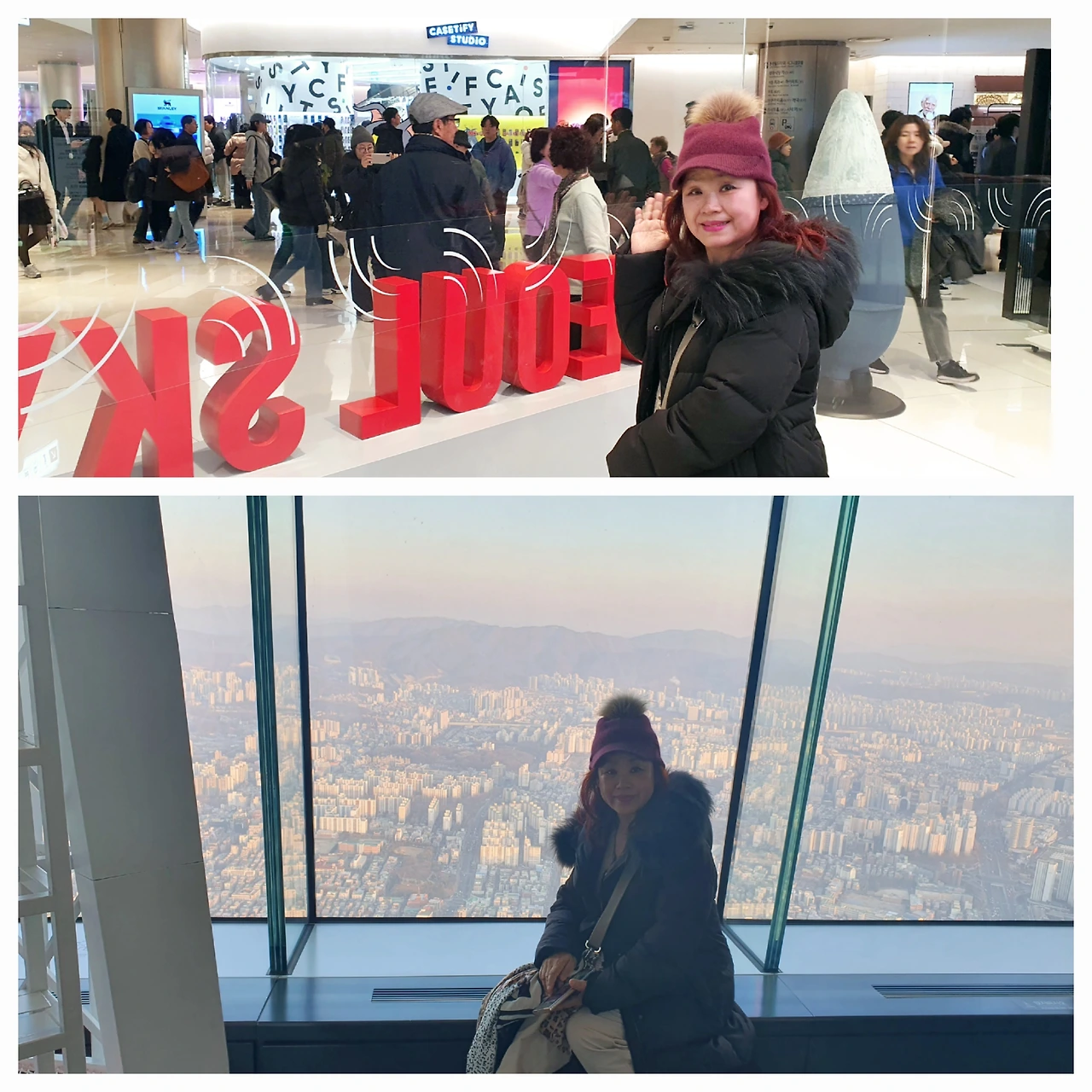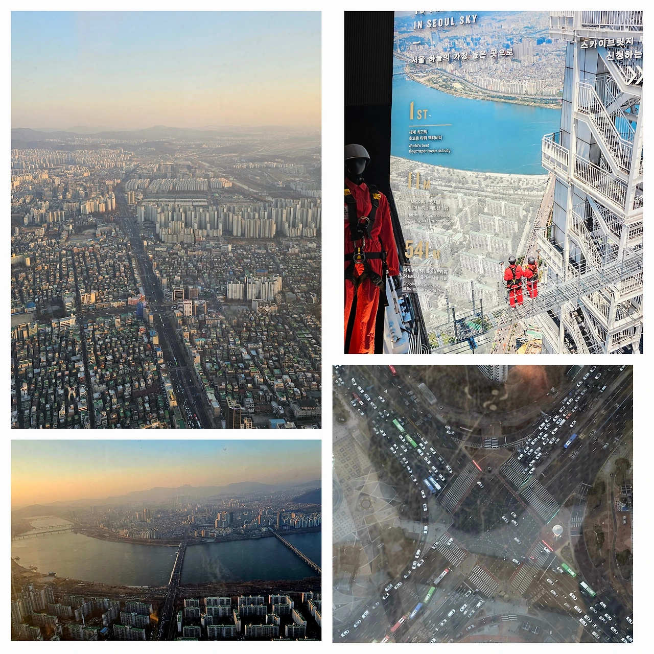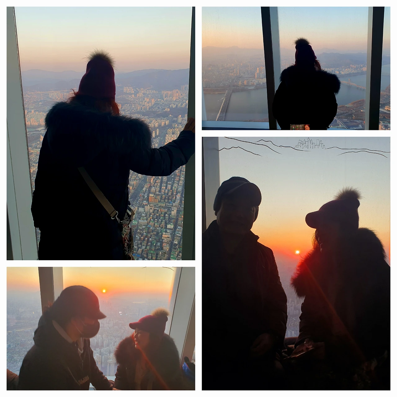 드디어 엘리베이터를 타고 올라가는데 117층 전망대까지 딱 1분이 걸렸으니 귀가 멍했다. 아쉬운 점은 유리창 너머 바깥 풍경이 예상보다 흐릿했는데 생각해 보니 안쪽 유리는 자주 닦아도 바깥은 고층 빌딩 유리창 청소부가 생각나면서 어떻게 자주 닦을 수 있을까 싶었다.
