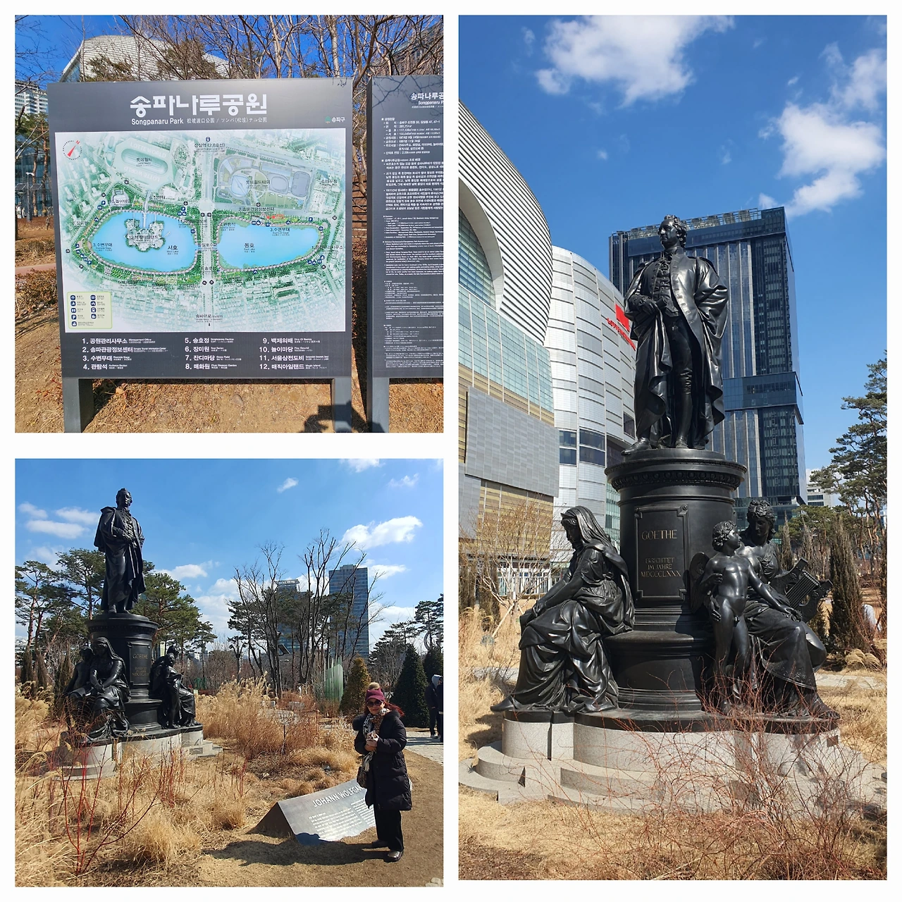 지나다 갑자기 괴테동상이 보여 이건 뭔가 싶어 보니 재미있게도 롯데란 이름과 연관시켜 만든 건축물이었다.롯데란 기업명이 괴테의 '젊은 베르테르의 슬픔'의 여주인공 샤롯데(Charlotte)에서 기원했기에 독일 괴테재단과 함께 롯데타워 앞에이 동상을 세웠다는 설명이 적혀 있었다.