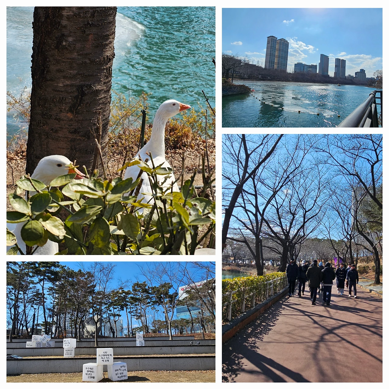 호숫가에 아직 덜 녹은 얼음이 동동 떠 있고 거위들이 주변에 있었다.