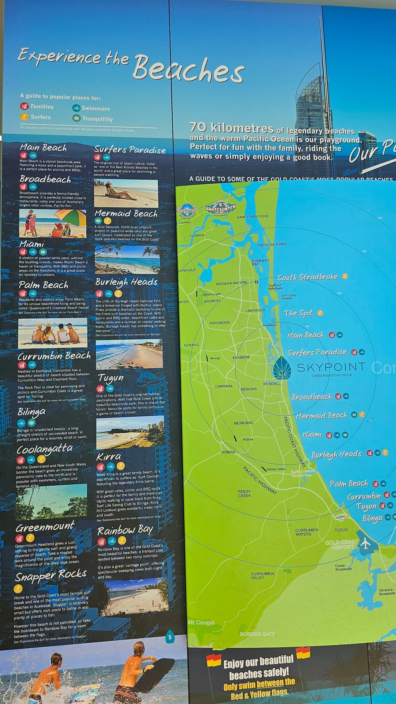 그녀 집에서 잘 쉬고 이튿날은 골드 코스트로 갔다. 첫날 기차타는 곳까지 나를 데려다 준 그녀는 골드 코스트가는 방법도 상세히 일러줬다. 해변 길이가 57킬로라는 어마한 해변을 전망대 위에서 바라보기 위해 기차를 타고 한 시간 걸려 갔는데 마치 소풍 가듯 즐거운 마음이었다.