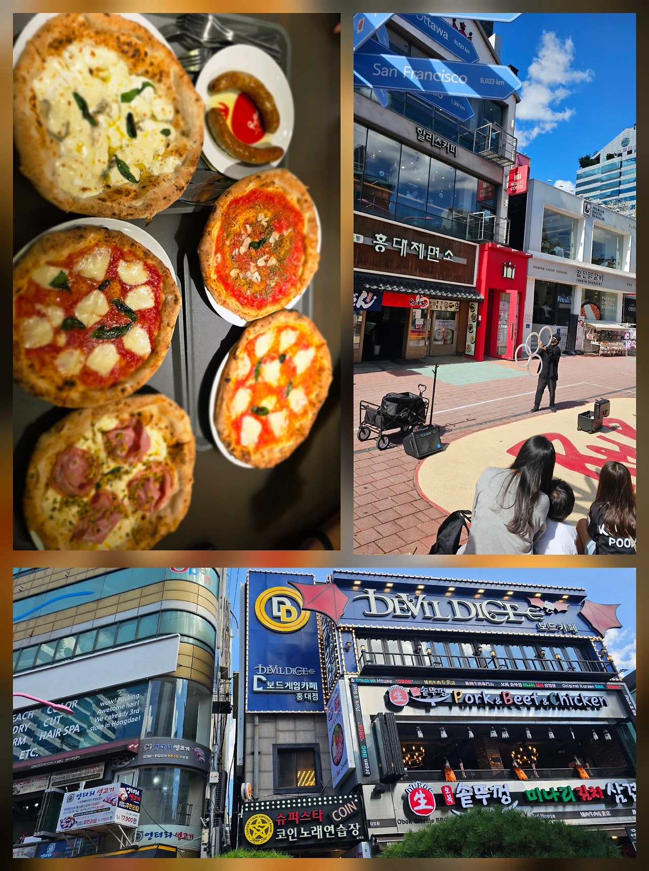 ~홍대 메인거리에 고깃집과 왼편 건물 이층 미용실 홍보도 재밌다. 이태리 장인이 구운 나폴리 화덕 피자는 맛있었다.
