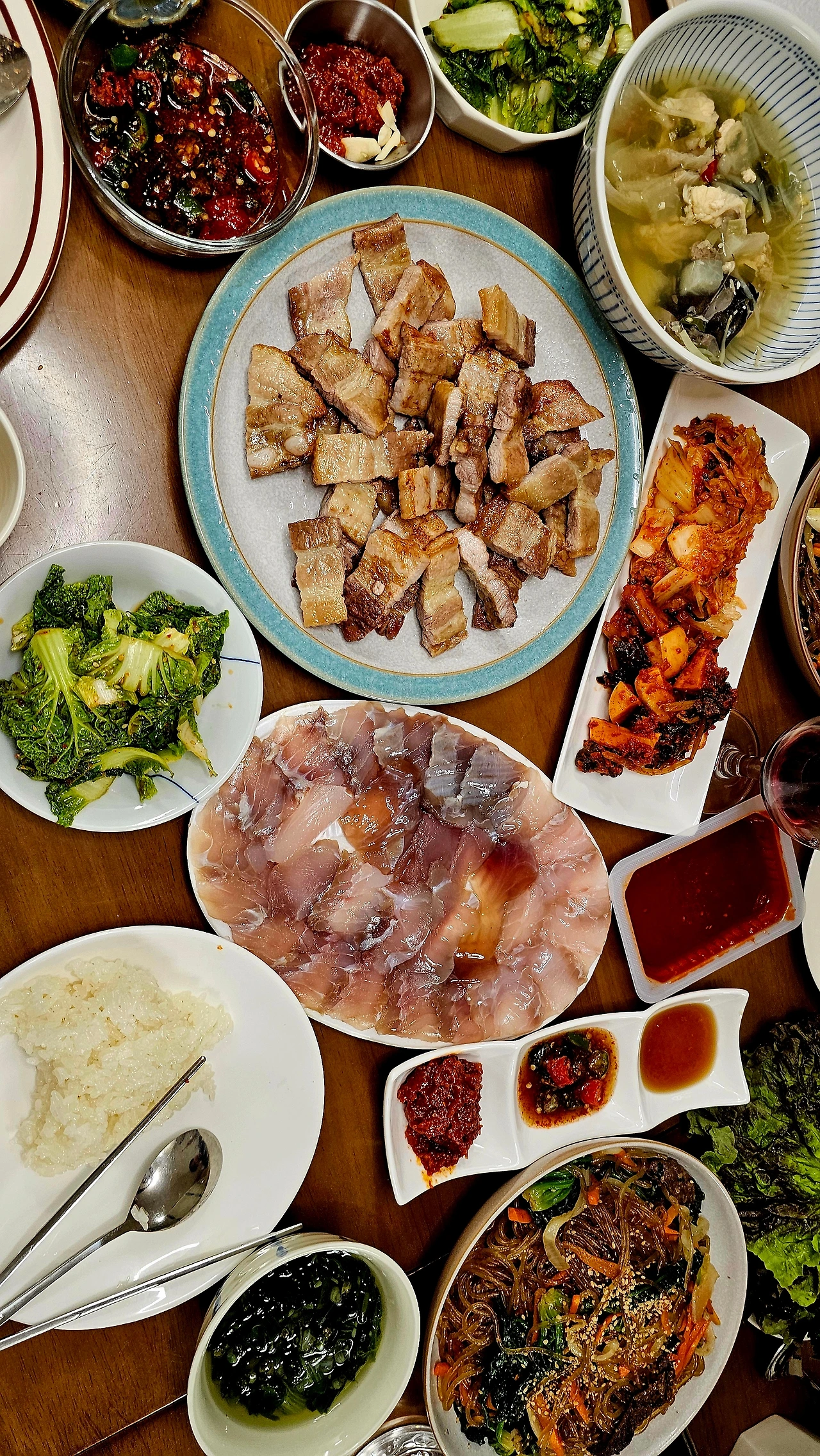 둘째는 일단 엄마표 잡채가 맛있다 하고 삼합으로 준비한 국내산 홍어랑 잘 구워진 두툼한 삼겹살을 먹으며 좋아한다. 간에 좋다는 다슬기 국과 아귀탕을 시원하게 끓였지만 국을 원래도 좋아하지 않는 둘째는 세 숟갈 이상 먹지 않는다. 그러고는 더 이상 못 먹겠다며 밥 숟갈을 놓는다.