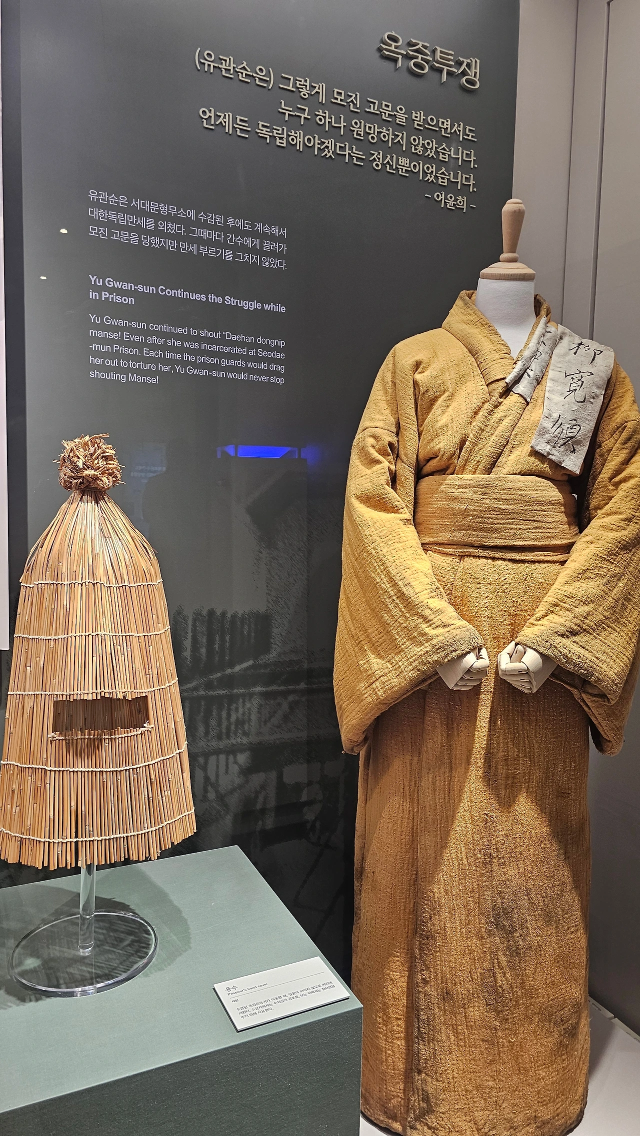 그 무시무시한 서대문 형무소를 감내하셨다. 형무소 옷에 유관순이란 이름이 적혀있다. '용수'라 불리던 저 모자같은 것은 일제가 독립운동가들이 이동할 때 머리에 씌우던 것이다. 수감자들에게는 수치심과 공포를, 지켜보던 사람에게는 혐오감을 조성하기 위해 만든 모자라 한다.