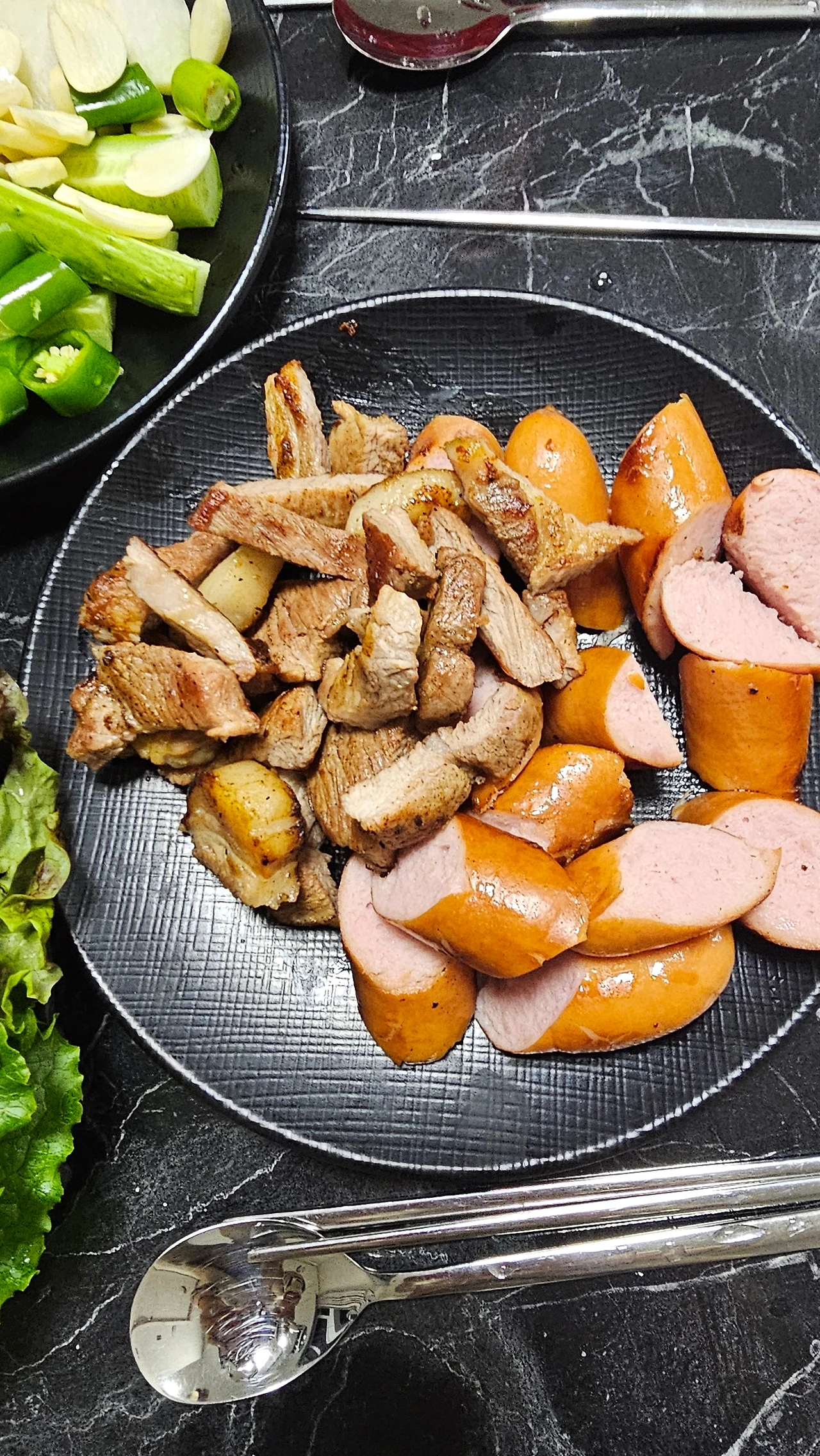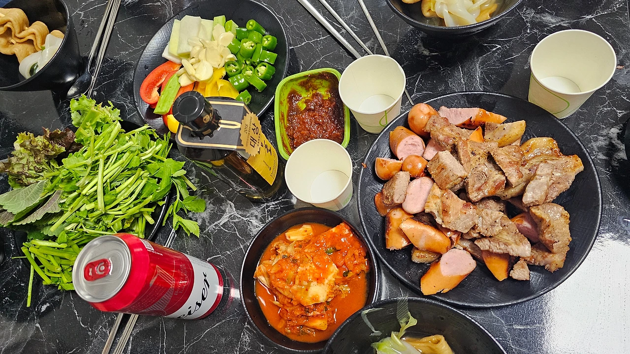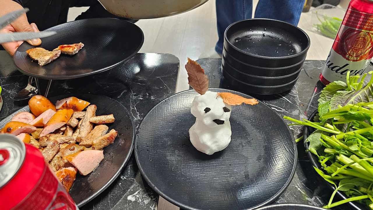 태학산 휴양림 숙소로 올라가는데 벌써 눈이 좀 쌓여있다. 지부장님께서 숯불구이를 완벽하게 준비하셨는데 최근 변동된 규칙으로 금지령이 내려 팬에 구워야만 했다. 그러나 공기는 쾌청하고 숙소도 깔끔해서 마음이 t시원했다. 바베큐의 정석인 소시지도 팬에 구어 불로 지져내니 정말 맛있었다.