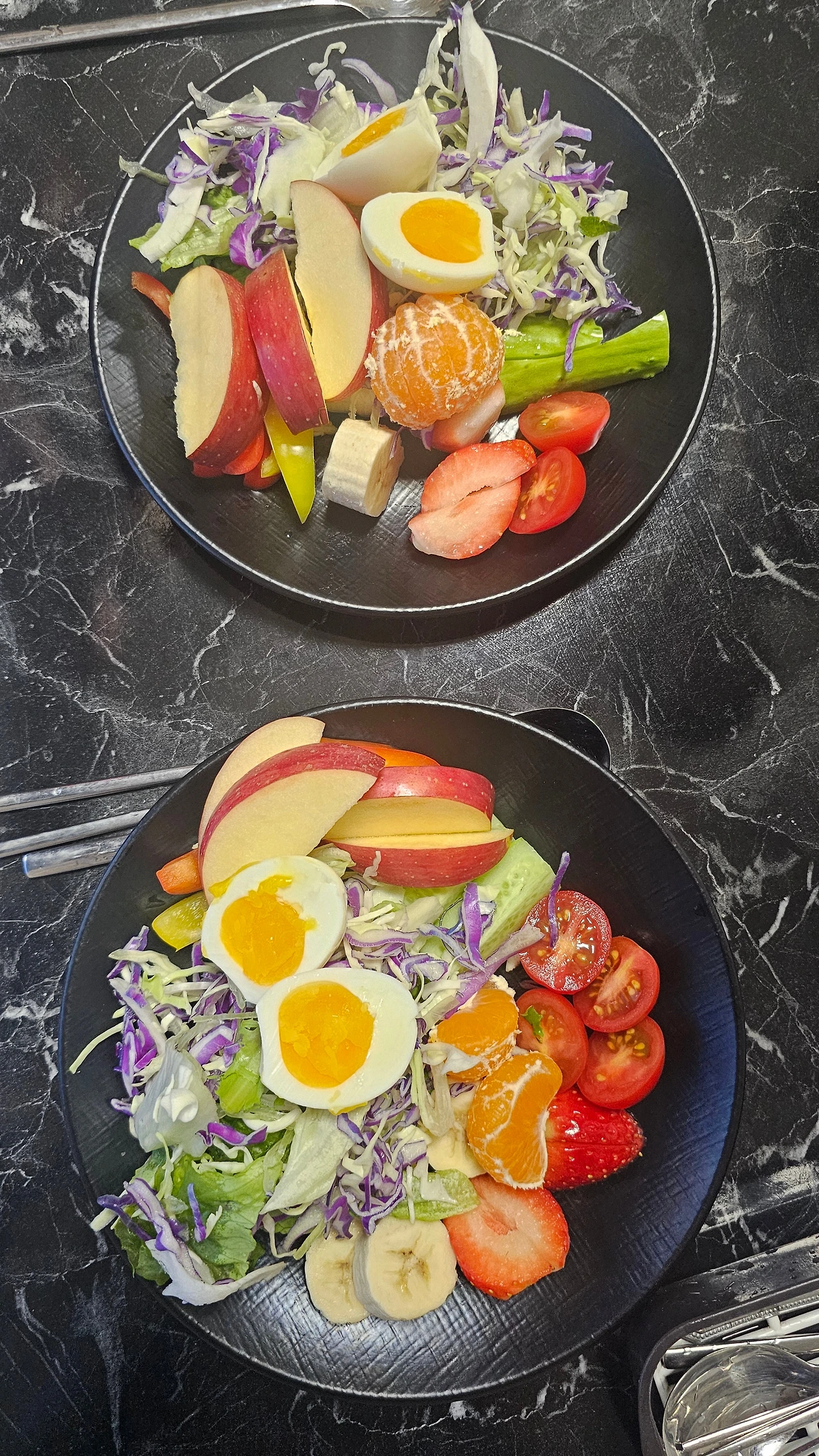 아침은 색갈 화려한 샐러드와 땅콩버터 바른 곡물빵 그리고 미리 준비해 온 병아리콩 수프로 먹었다. 건강영양 만점 식단이 되도록 늘 신경을 써 주는 똑순이 김 여사님의 수고에 매번 감사하다.