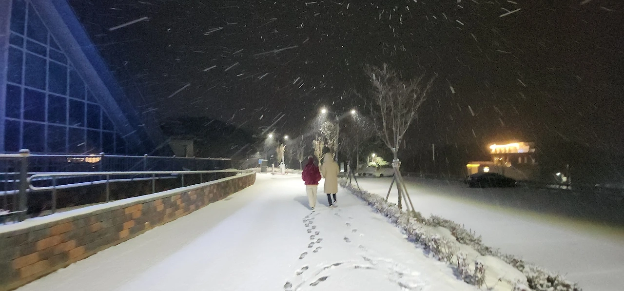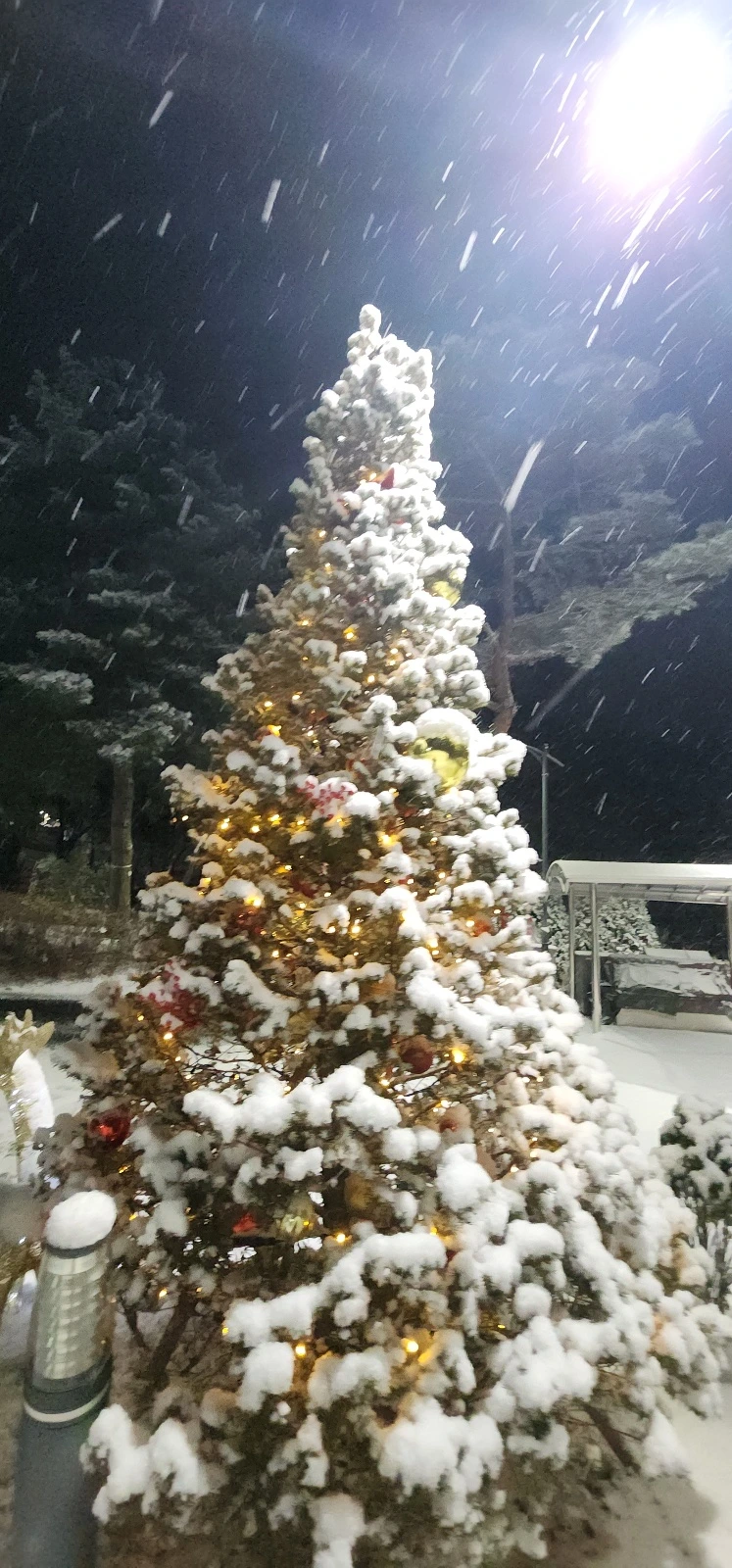 저녁 내내 먹은 칼로리는 빼야 하니 모두 눈길 산책하러 나갔다. 우리 나이에 이제 하루 치 운동 복용량 만보는 채워야 한다. 벌써 눈꽃을 피워낸 나무들이 싱그럽고 큰 추리도 미리 크리스마스 메리 크리스마스를 외친다. 밤길 산책에 웃고 떠드느라 소화가 다 되었다.