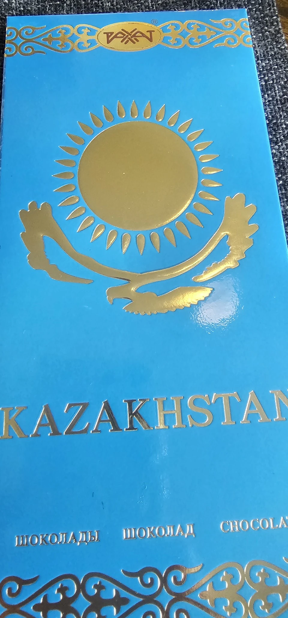 가이드 타밀란이 카자흐스탄 국기포장의 초콜릿을 선물로 주었는데 센스있는 선물이다. 국기에는 하늘색 바탕에 황금색의 카자흐 전통 문양과 32줄기 태양 그리고 초원수리가 그려져 있다