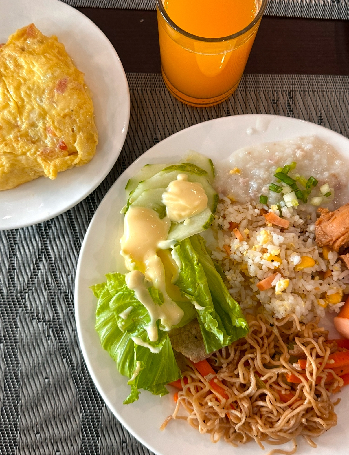 밥 조금, 면 조금, 고기, 소시지, 샐러드.
