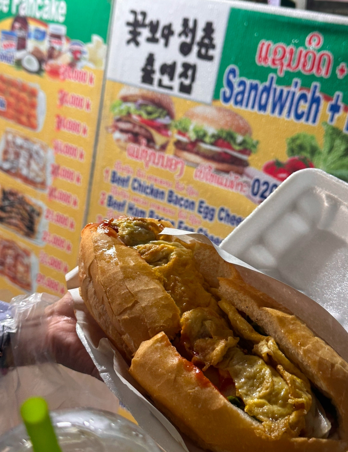 라오스의 바게트 샌드위치는 길쭉한 바게트빵을 기름을 잔뜩 두른 철판에 구워주는데 그 안은 풍성한 식재료로 가득 차있다.