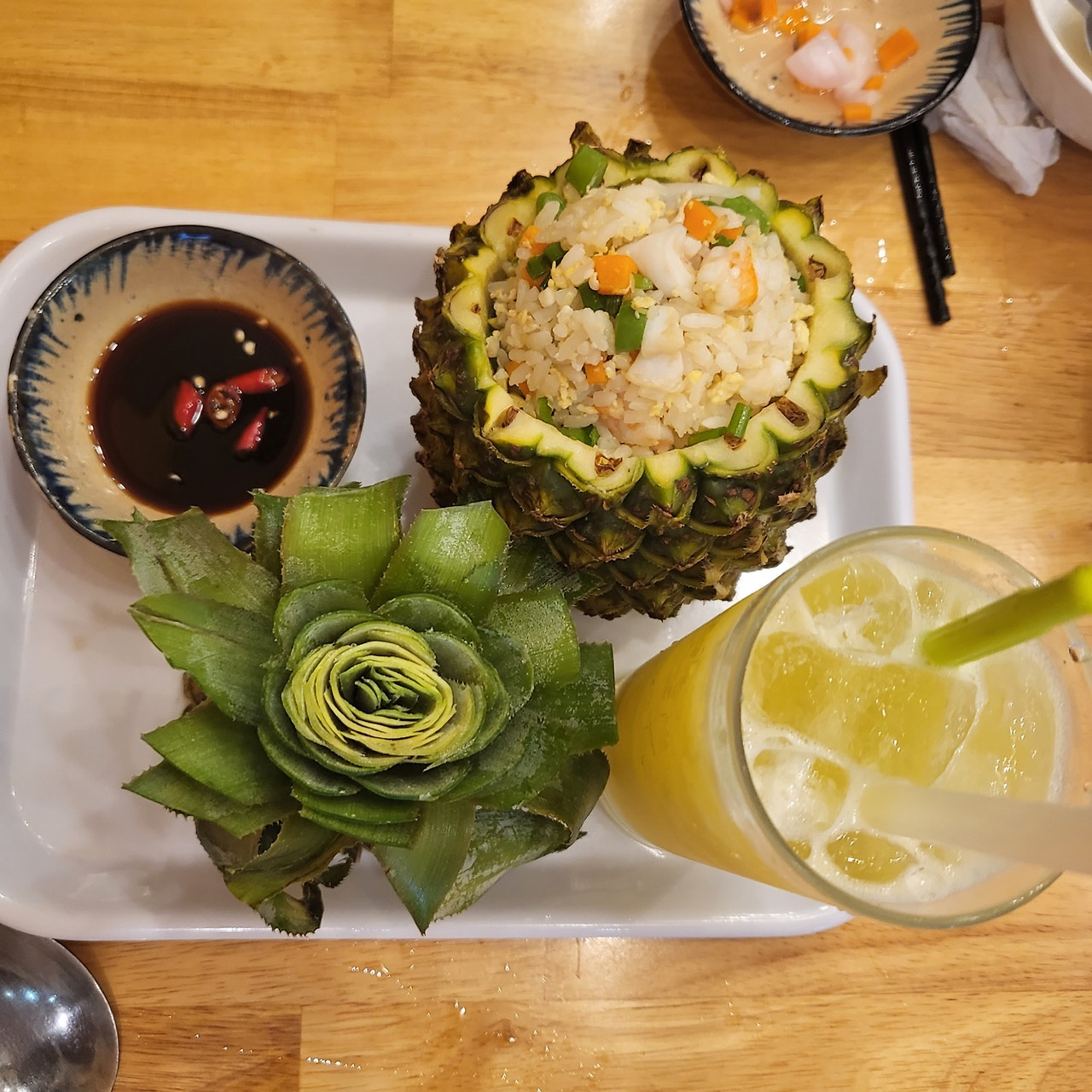 숙소에서 걸어서 5분 정도 거리에 위치한 식당은 한눈에 보아도 깔끔해 보였다. 우리는 파인애플 볶음밥과 해물볶음면, 그리고 한국에 돌아가면 단연코 생각이 날 쌀국수를 다시 한번 주문했다. 주문한 메뉴들이 차례로 나왔다. 가장 기대했던 파인애플 볶음밥은 기대 이상으로 맛있었다. 파인애플의 속을 볶음밥으로 채운 것이었는데 파내버린 파인애플로 음료를 만들어 함께 제공된다. 어찌나 맛있었는지 이미 긁어내서 나온 파인애플 속을 수저로 박박 긁어먹었다. 쌀국수도 진한 육수는 아니었지만 깔끔하고 부드러워 맛있었다. 함께 제공되는 다진 마늘과 베트남 고추를 취향껏 넣고 사장님이 직접 담그셨다는 마늘청을 조금 넣어먹으니 다른 곳에서 먹어본 적 없는 쌀국수맛이 탄생했다. 이모는 베트남 여행에서 쌀국수를 주문할 때마다 함께 오는 민트에 푹 빠져버렸고 몇 번이나 리필해서 먹었다. 식사를 마친 후 두 사람은 배가 엄청 부르지만 다른 메뉴도 궁금하다며 하나만 더 시키자고 했다. 우리는 고민 끝에 다른 종류의 볶음밥을 먹어보기로 했다. 메뉴는 금방 나왔고 파인애플에 들어있지 않다 뿐 다를 것 없는 볶음밥이 나왔다. 우리는 웃음을 감추지 못했고 역시나 맛있는 볶음밥이었다. 그릇을 싹 비운 후에도 금방 일어나지 못할 정도로 배가 불렀다. 이 틈을 타 호기심 대마왕 이모는 한국인 사장님께 궁금했던 것을 전부 물어보았다. 특히 오토바이 운전자들이 모두 헬멧을 착용하고 있는 이유가 여행 내내 궁금했기에 가장 먼저 물어보았다. 베트남에서는 어린 시절부터 오토바이에 익숙하기에 면허 없이 운전하는 사람들이 많은데 헬멧을 쓰지 않고 가다가 혹여 경찰에 잡히면 큰 벌금을 내야 한다는 것이었다. 일주일간의 의문을 해결하고 나니 이모의 표정이 한결 더 가벼워 보였다.
