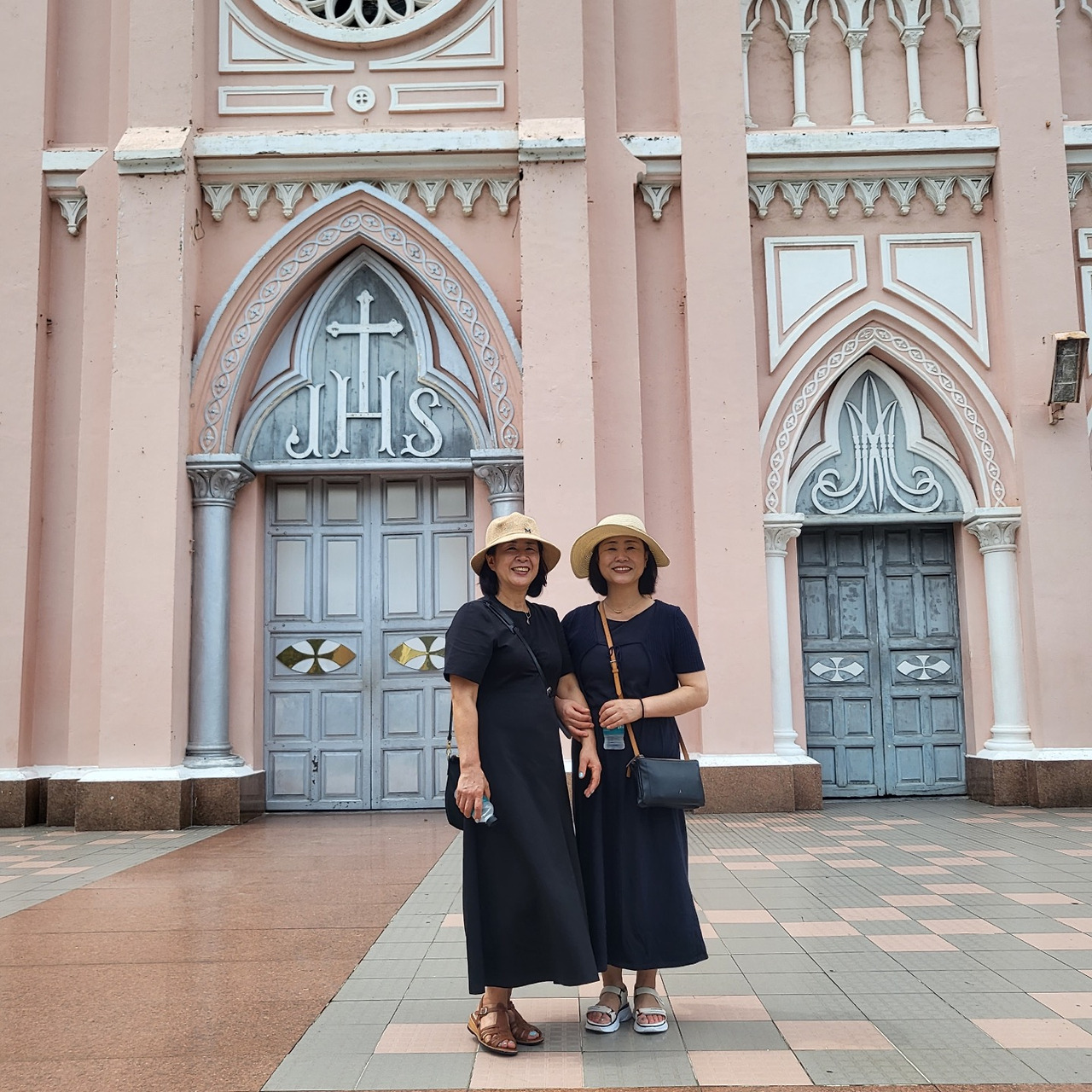 이모도 모자를 챙겨 왔다며 한국에서 가져온 모자를 썼다. 그런데 이런, 취향까지 닮은 건가. 어째 두 사람은 모자까지 비슷하다. 서로 꼭 닮은 모습을 한 채 과일가게 앞을 지나던 참이었다. 달달한 망고냄새가 코를 찔렀고 그냥 지나칠 수 없었던 우리는 숙소에 돌아가 먹을 망고를 바로 구매했다. 그때 내 코를 자극하는 익숙한 구린내가 풍겼고 돌아본 곳에는 반갑게도 두리안이 있었다! 내가 가장 사랑하는 과일인 두리안. 엄마와 이모에게도 맛을 보여줘야겠다 싶어 반쪽을 함께 구매했다. 이모는 그냥 하나 다 사지 왜 반만 사냐며 나무랐지만 일단 먹어보고 또 사자며 2층으로 향했다. 2층에는 베트남 전통복인 아오자이를 맞추거나 현지옷을 구매할 수 있는 곳이다. 원래는 두 사람의 아오자이를 맞출 예정이었지만 한 번 밖에 못 입는 옷을 사고 싶지 않다며 한사코 거절했다. 아오자이를 입고 호이안에서 꼭 사진을 찍어주고 싶었는데. 두 사람은 낭만이 없나 보다. 아쉬운 대로 그 옆에서 원피스라도 고르라고 했고 두 사람은 이것저것 서로의 몸에 대보며 옷을 골랐다. 엄마랑 이모는 서로 비슷한 옷을 입는 것이 좋았는지 원피스도 비슷한 것으로 골라 입기로 했다. 디자인은 똑같지만 서로 패턴만 조금씩 다른 옷을 골랐고 역시나 흥정을 통해 저렴한 가격으로 구매할 수 있었다. 흡족한 표정으로 시장을 빠져나와 숙소로 돌아가기 전 우리는 핑크 성당에 들렀다. 무언가를 하려고 간 것은 아니었고 단지 사진을 남기기 위해서였다. 유명 관광지이기에 사람들이 북적북적했지만 잠시 사람들이 없어진 틈을 타 재빨리 두 사람을 성당 가운데로 데려갔다. 비슷한 옷을 입고 똑같은 포즈를 한 두 사람을 보니 절로 웃음이 나왔다. 투샷을 잔뜩 찍은 뒤 단독샷을 찍으려는데 이모가 너무 어색해했다.