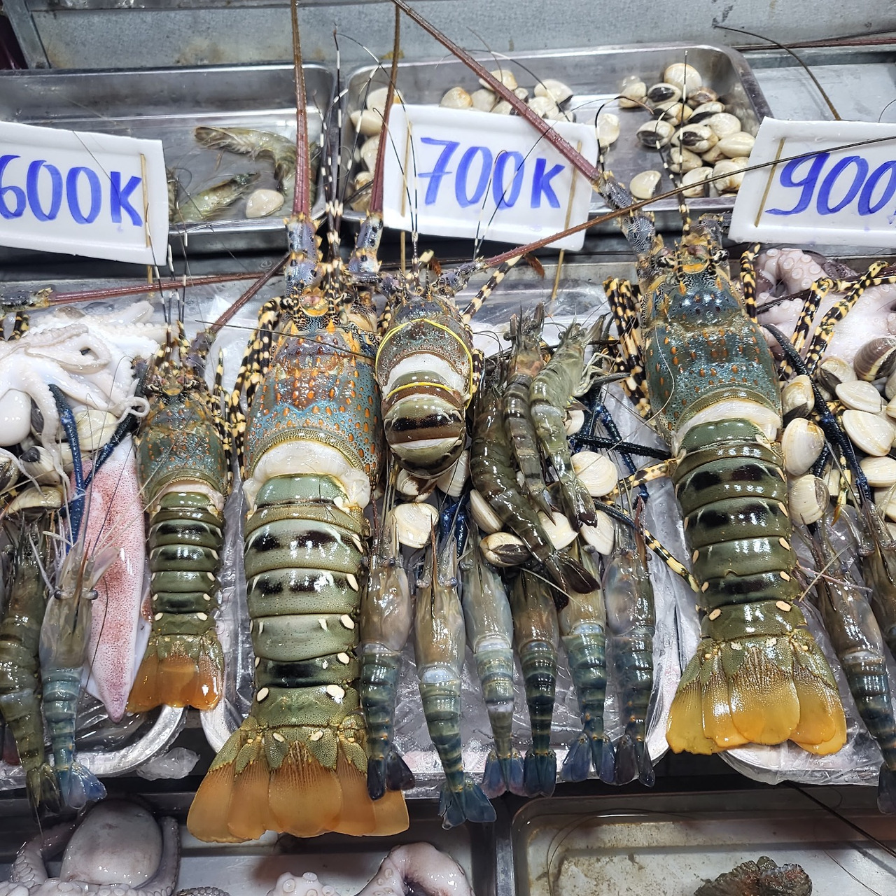 우리는 한바탕 웃으며 망고를 집어 먹었고 야시장을 향해 출발했다. 선짜야시장은 다낭 시내에서 가장 가까운 야시장이다. 동남아의 야시장은 다양한 먹거리와 쇼핑거리, 볼거리가 있어 시간 가는 줄 모르고 구경하게 되는 곳이다. 우리가 도착한 시간은 야시장이 한창일 시간이라 사람들이 북적북적했다. 야시장 특유의 야식들을 구경하며 돌아다니다가 랍스터구이를 먹기로 했다. 여러 가게들 중 우리에게 가장 적극적으로 호객행위를 했던 집을 골랐고 수차례의 가격 흥정과 해산물의 구성을 흥정하여 마음에 드는 구성과 가격으로 합의를 했다. 혹시나 하는 마음에 우리가 합의한 구성을 사진으로 미리 사진으로 남겨 두었고 우리의 구이가 나오기만을 기다렸다.