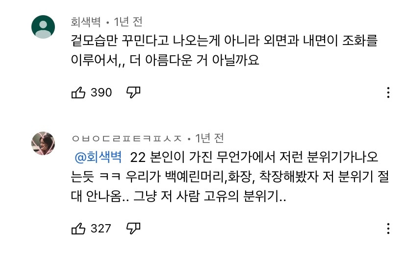 유튜브 영상엔 백예린 특유의 분위기를 닮고싶다는 댓글이 달렸다. 공감하는 이가 많았는지, 좋아요가 만 명을 넘어간다.