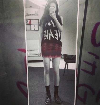 (오른쪽 사진) 티셔츠와 치마 둘 다 타이트 핏이다보니까, 조금 부담스럽게 보이죠. 상의를 헐렁하게 입고 붙는 치마를 입던지, 아님 살짝 붙는 상의에 퍼지는 치마를 입는 게 좋습니다.