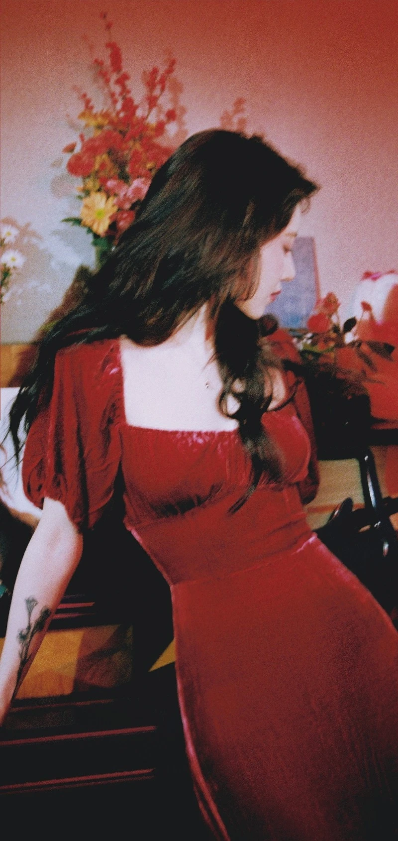 와인색 원피스는 고혹적인 분위기를 풍기기 때문에, 좀 전에 봤던 푸른 색감이 붉은 색감 사진보다 분위기 연출에 더욱 적합해보입니다.