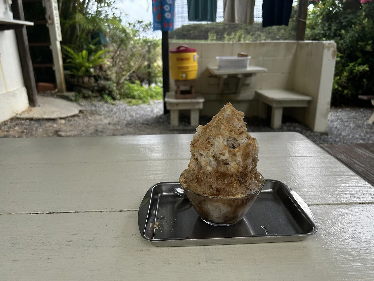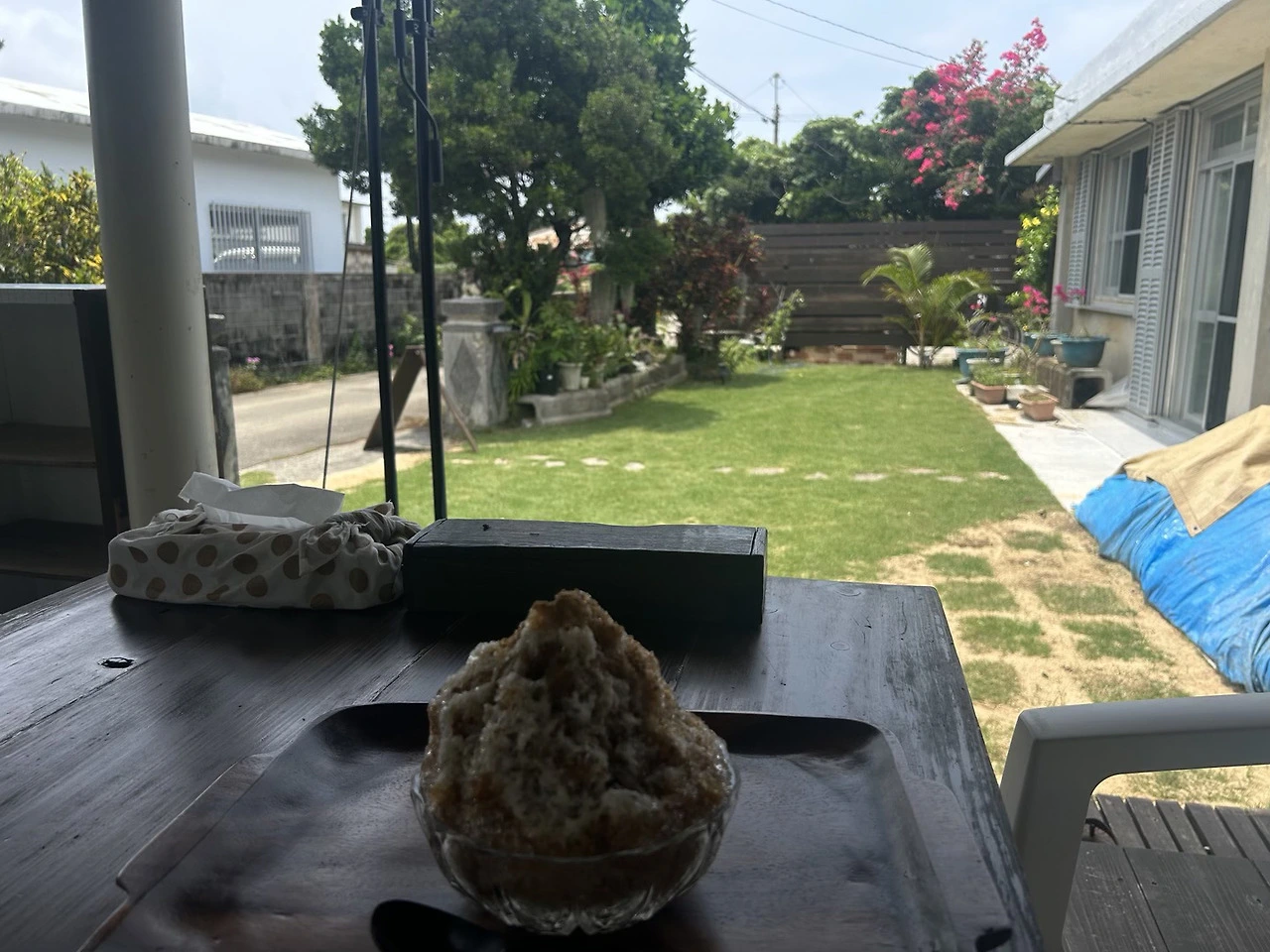 밥도 만족스럽게 먹었으니 디저트를 먹어야 하여 취락 쪽으로 자전거를 타고 카페를 찾았다. ‘아토후소코’ (이것도 일본어는 아닌 듯하다)라고, 집을 개량한 듯한 카페가 있어 들어가 보았다. 당최 커피나 여유롭게 한 잔 할 생각이었는데, 오키나와산 흑설탕 빙수를 팔고 있었다. 흑설탕도 빙수도 좋아하는 나인지라, 호기심 반 기대 반으로 빙수를 시켰다. 한 입 먹었더니, 아삭아삭 씹히는 얼음과 흑설탕의 조화로 더위가 싹 가시는 기분이었다. 간 얼음과 설탕뿐인데 이렇게 맛있다니, 연신 감탄하면서 먹었다. 카페 야외테이블에서 빙수를 먹으면서 하테루마의 시골길을 천천히 감상하였다.
