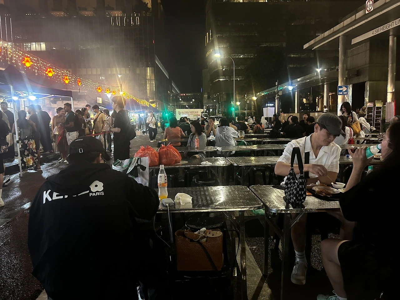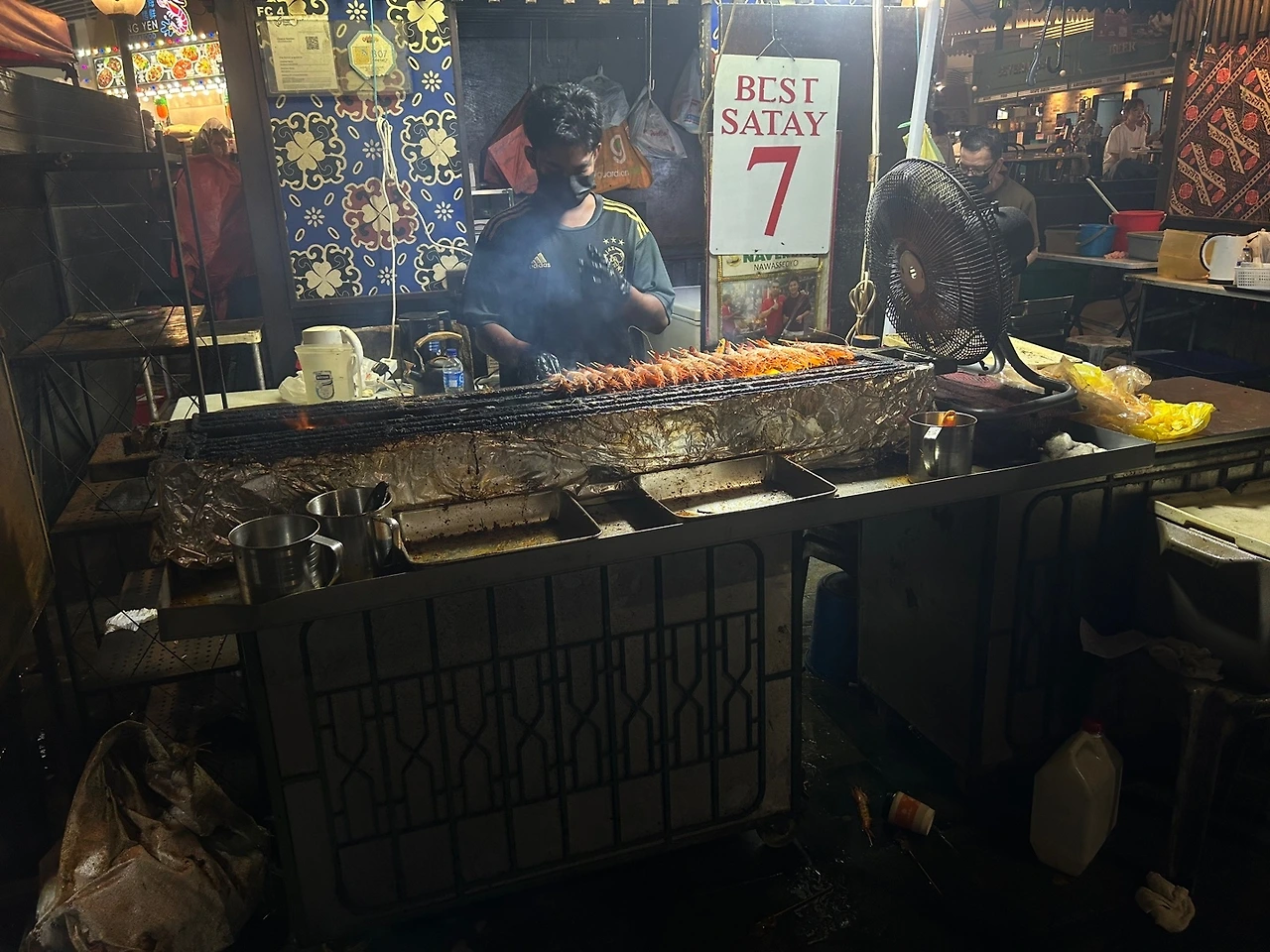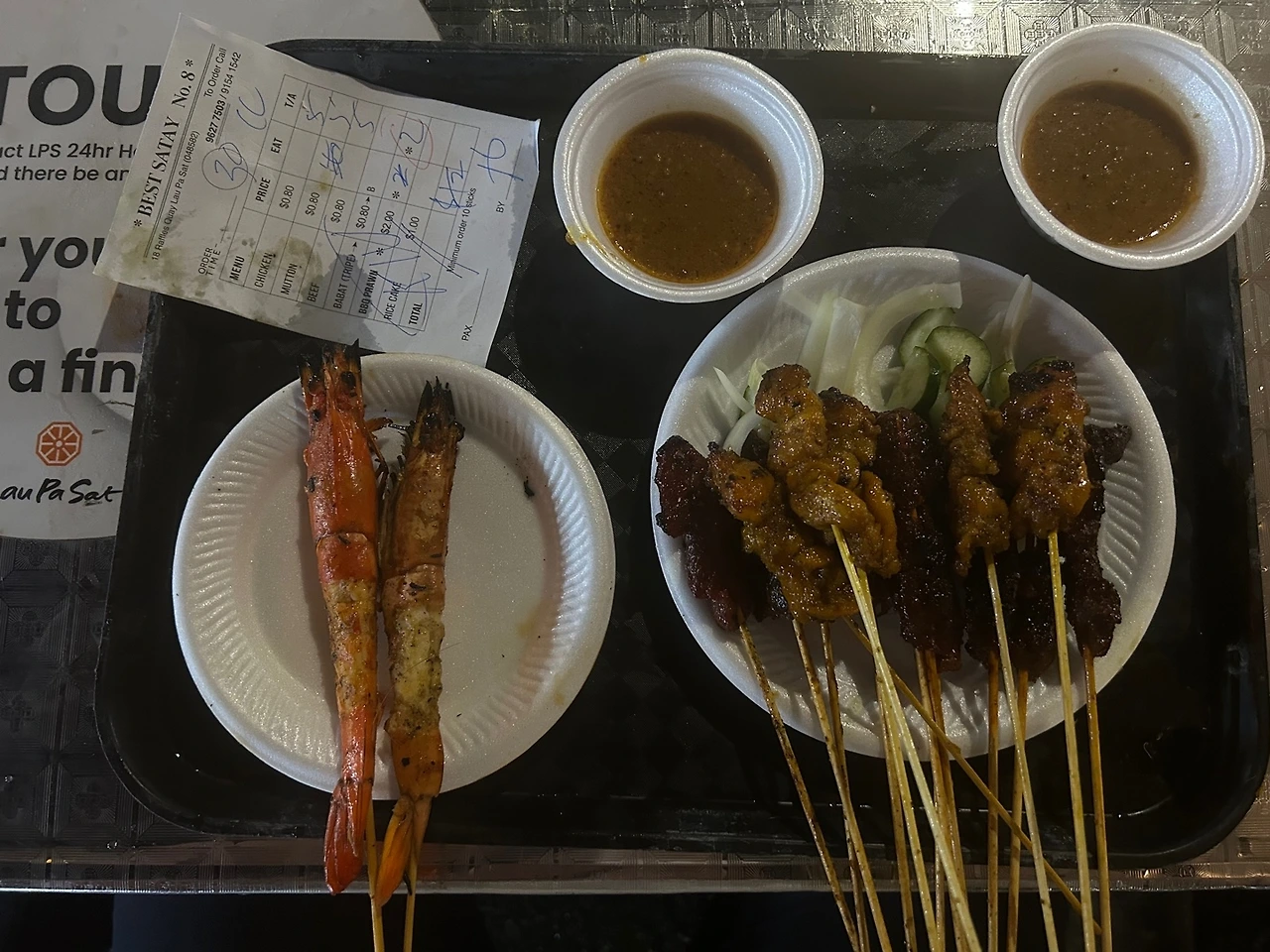 • 바인데, 의외로 11시에 문을 닫아서 이른 해산을 했다. 그런데 아까 10개 밖에 안 먹은 사테가 너무너무 아쉬운 것이 아닌가. 마침 레벨 33에서 걸어서 얼마 안 되는 거리에 ’라우 파 삿‘이라는 푸드코트가 있어서 그쪽으로 발걸음을 향했다. 이곳의 차도는 오후 7시가 되면 차량을 통제하고 포장마차로 바뀌게 되는데, 이곳을 ’사테 거리‘라고 한다. 말 그대로 사테를 파는 포장마차들이 여러 개가 있었다. 사테 맛이야 어디든 다 고만고만할 것 같은데, 이상하게도 7번, 8번 집이 유명해서 그런지 이쪽만 줄이 길었다. 나도 괜히 맛없는 곳을 가고 싶진 않아서 여기에 줄을 섰다.