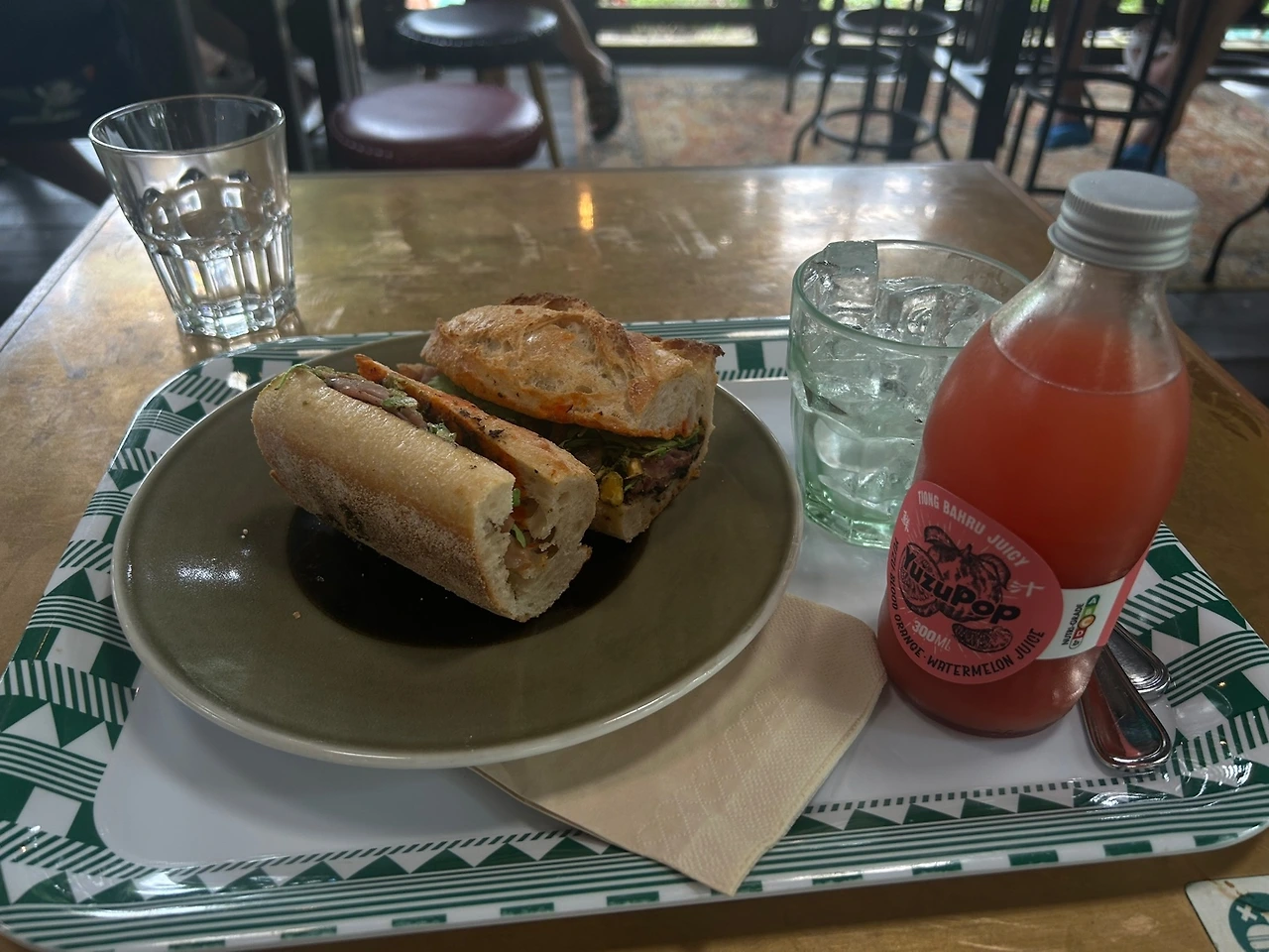 • 와보니 혼자 온 사람은 드물고, 대개는 가족단위로 많이 와있었다. 나는 아침으로 절인 베이컨과 버섯이 들어가 있는 바게트 샌드위치와 ‘유자팝’이라는 과일 음료수를 한 병 주문했다. 그런데 2만 원이 넘게 나오다니… 역시 싱가포르 물가는 싸지 않다고 느꼈다. 샌드위치는 피자처럼 각종 야채와 햄들이 어울려서 무난하게 맛있었다. 엄청 특별한 맛은 아니었는데, 사진을 볼 때마다 자꾸 먹고 싶어지는 맛이었다.